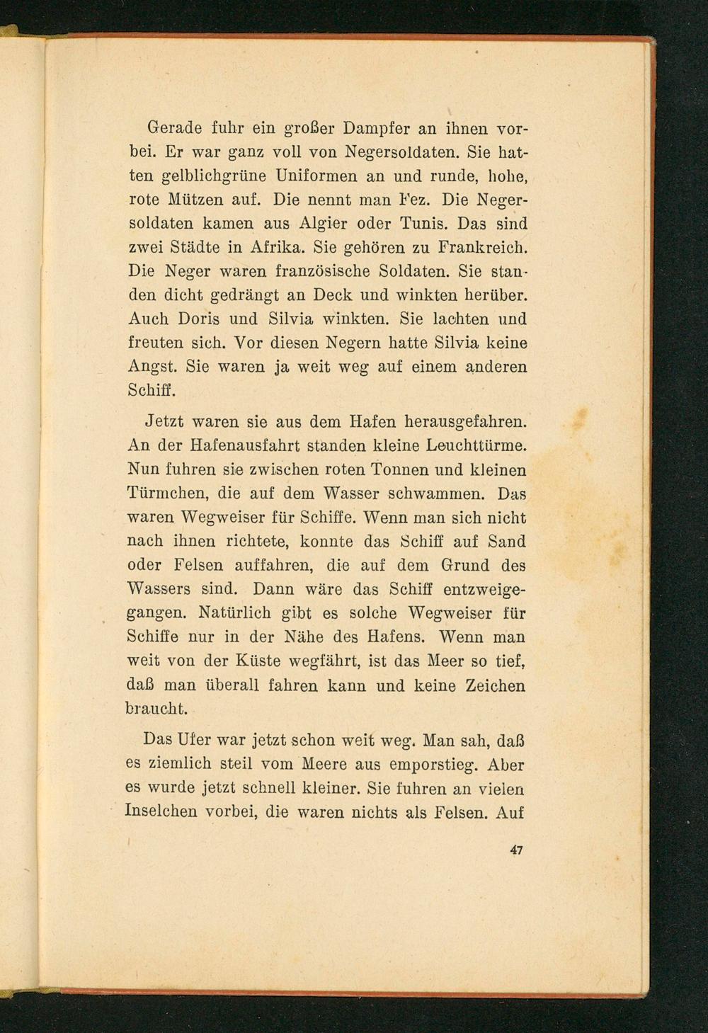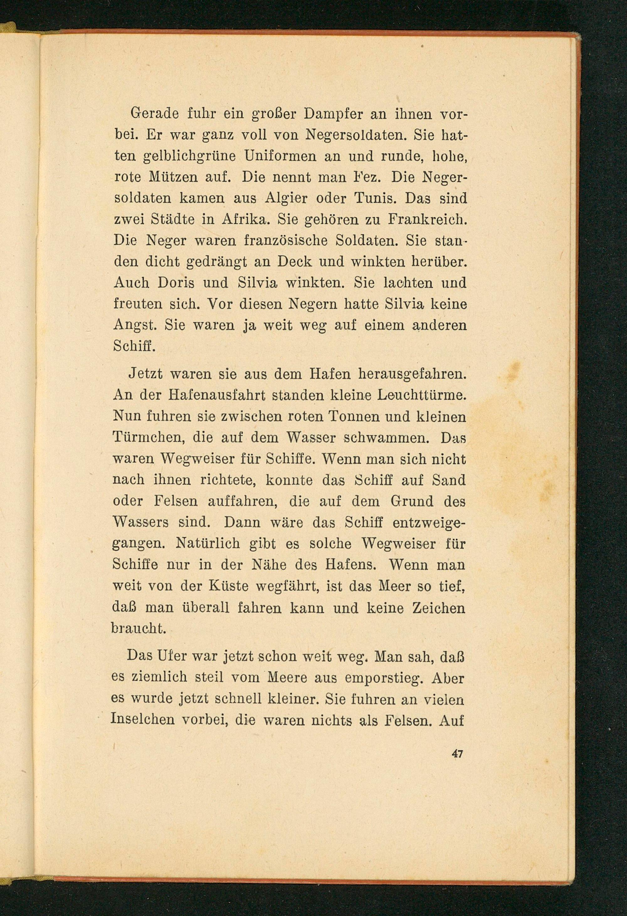 Gerade fuhr ein großer Dampfer an ihnen vorbei. Er war ganz voll von Negersoldaten. Sie hatten gelblichgrüne Uniformen an und runde, hole, rote Mützen auf. Die nennt man Fez. Die Negersoldaten kamen aus Algier oder Tunis. Das sind zwei Städte in Afrika. Sie gehören zu Frankreich . Die Neger waren französische Soldaten. Sie standen dicht gedrängt an Deck und winkten herüber. Auch Doris und Silvia winkten. Sie lachten und freuten sich. Vor diesen Negern hatte Silvia keine Angst. Sie waren ja weit weg auf einem anderen Schiff.