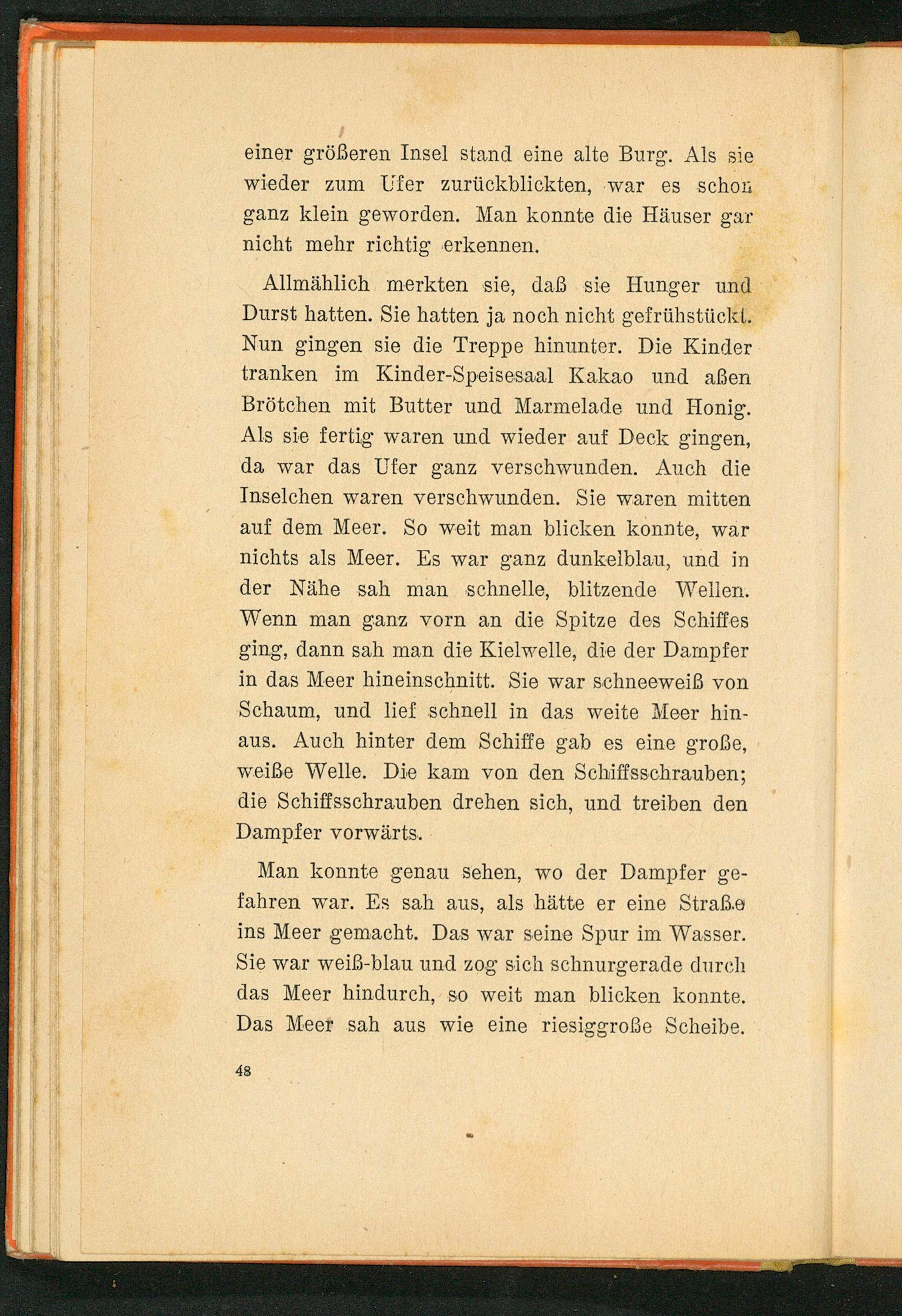 Allmählich merkten sie, daß sie Hunger und Durst hatten. Sie hatten ja noch nicht gefrühstückt. Nun gingen sie die Treppe hinunter. Die Kinder tranken im Kinder- Speisesaal Kakao und aßen Brötchen mit Butter und Marmelade und Honig. Als sie fertig waren und wieder auf Deck gingen, da war das Ufer ganz verschwunden. Auch die Inselchen waren verschwunden. Sie waren mitten auf dem Meer. So weit man blicken konnte, war nichts als Meer. Es war ganz dunkelblau, und in der Nähe sah man schnelle, blitzende Wellen. Wenn man ganz vorn an die Spitze des Schiffes ging, dann sah man die Kielwelle, die der Dampfer in das Meer hineinschnitt. Sie war schneeweiß von Schaum, und lief schnell in das weite Meer hinaus. Auch hinter dem Schiffe gab es eine große, weiße Welle. Die kam von den Schiffsschrauben; die Schiffsschrauben drehen sich, und treiben den Dampfer vorwärts.