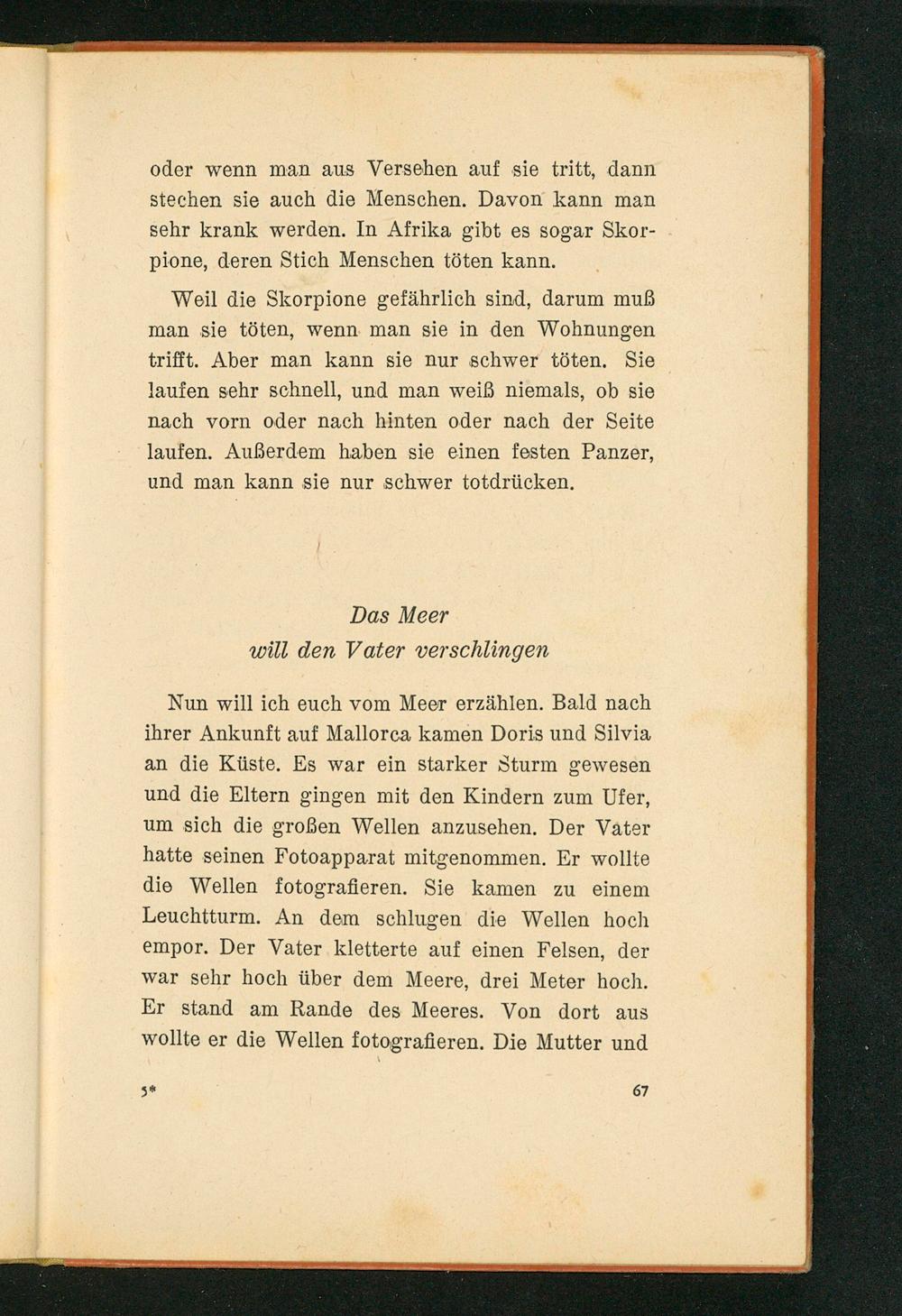 Nun will ich euch vom Meer erzählen. Bald nach ihrer Ankunft auf Mallorca kamen Doris und Silvia an die Küste. Es war ein starker Sturm gewesen und die Eltern gingen mit den Kindern zum Ufer, um sich die großen Wellen anzusehen. Der Vater hatte seinen Fotoapparat mitgenommen. Er wollte die Wellen fotografieren. Sie kamen zu einem Leuchtturm. An dem schlugen die Wellen hoch empor. Der Vater kletterte auf einen Felsen, der war sehr hoch über dem Meere, drei Meter hoch. Er stand am Rande des Meeres. Von dort aus wollte er die Wellen fotografieren. Die Mutter und