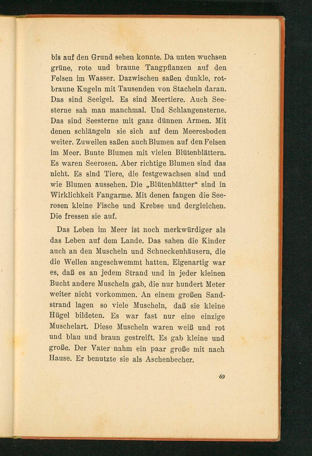 Das Leben im Meer ist noch merkwürdiger als das Leben auf dem Lande. Das sahen die Kinder auch an den Muscheln und Schneckenhäusern, die die Wellen angeschwemmt hatten. Eigenartig war es, daß es an jedem Strand und in jeder kleinen Bucht andere Muscheln gab, die nur hundert Meter weiter nicht vorkommen. An einem großen Sand- strand lagen so viele Muscheln, daß sie kleine Hügel bildeten. Es war fast nur eine einzige Muschelart. Diese Muscheln waren weiß und rot und blau und braun gestreift. Es gab kleine und große. Der Vater nahm ein paar große mit nach Hause. Er benutzte sie als Aschenbecher.