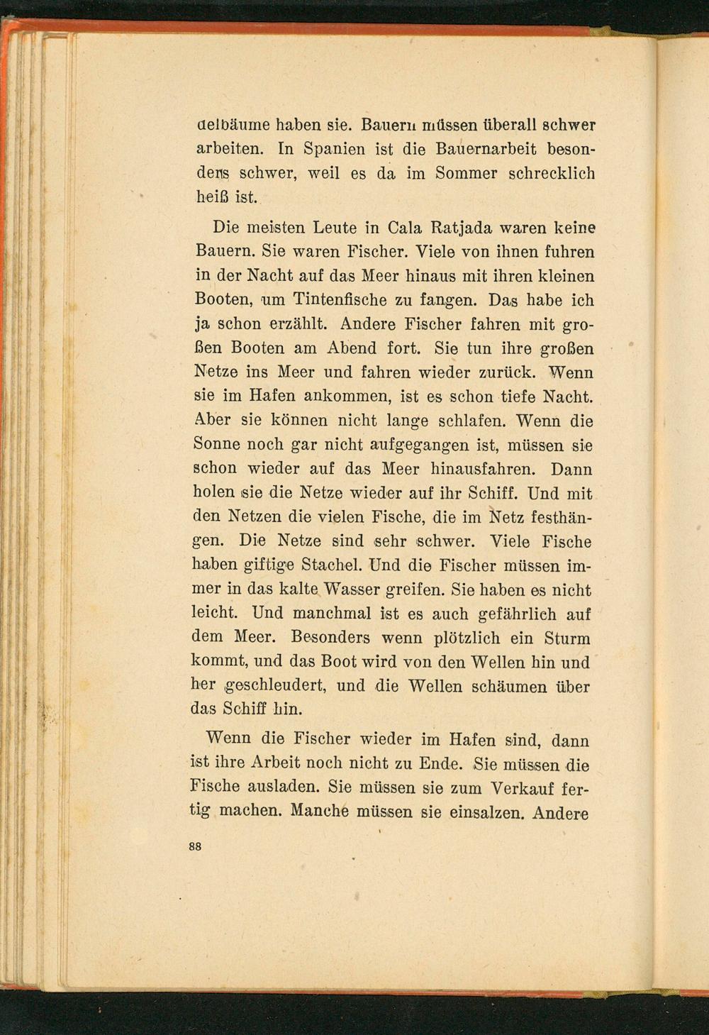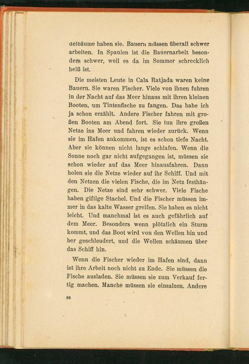 Die meisten Leute in Cala Ratjada waren keine Bauern. Sie waren Fischer. Viele von ihnen fuhren in der Nacht auf das Meer hinaus mit ihren kleinen Booten, um Tintenfische zu fangen. Das habe ich ja schon erzählt. Andere Fischer fahren mit groBen Booten am Abend fort. Sie tun ihre großen Netze ins Meer und fahren wieder zurück. Wenn sie im Hafen ankommen, ist es schon tiefe Nacht. Aber sie können nicht lange schlafen. Wenn die Sonne noch gar nicht aufgegangen ist, müssen sie schon wieder auf das Meer hinausfahren. Dann holen sie die Netze wieder auf ihr Schiff. Und mit den Netzen die vielen Fische, die im Netz festhängen. Die Netze sind sehr schwer. Viele Fische haben giftige Stachel. Und die Fischer müssen immer in das kalte Wasser greifen. Sie haben es nicht leicht. Und manchmal ist es auch gefährlich auf dem Meer. Besonders wenn plötzlich ein Sturm kommt, und das Boot wird von den Wellen hin und her geschleudert, und die Wellen schäumen über das Schiff hin.