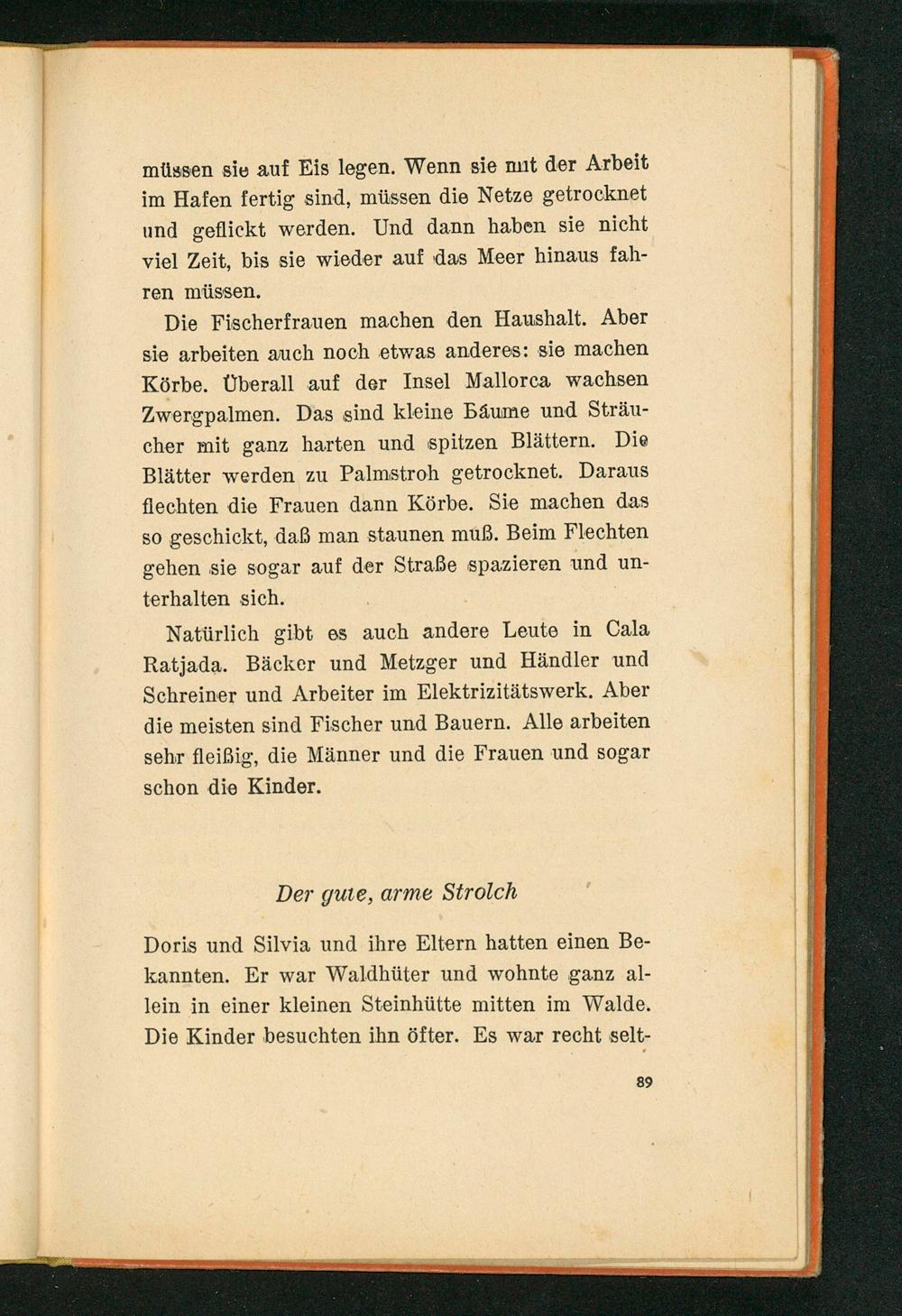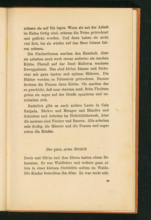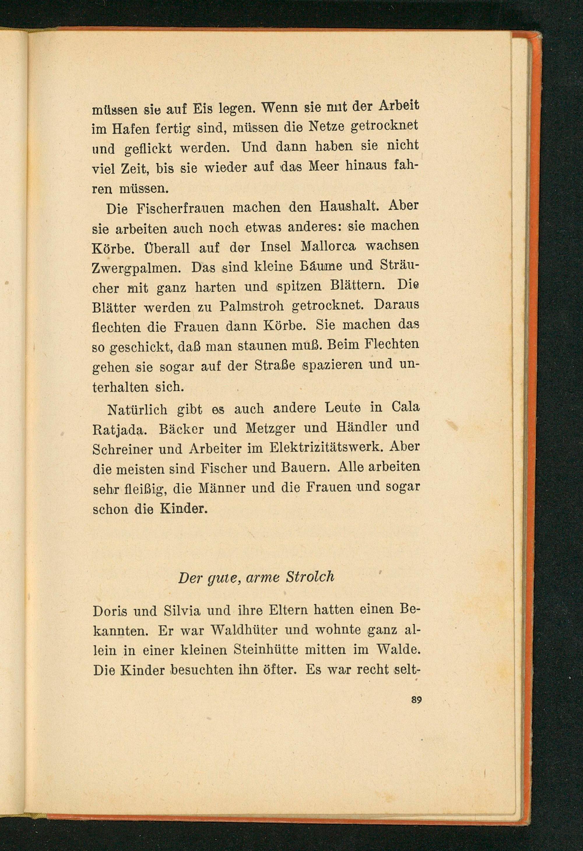 Die Fischerfrauen machen den Haushalt. Aber sie arbeiten auch noch etwas anderes: sie machen Körbe. Überall auf der Insel Mallorca wachsen Zwergpalmen. Das sind kleine Baume und Sträucher mit ganz harten und spitzen Blättern. Die Blätter werden zu Palmstroh getrocknet. Daraus flechten die Frauen dann Körbe. Sie machen das so geschickt, daß man staunen muß. Beim Flechten gehen sie sogar auf der Straße spazieren und unterhalten sich.