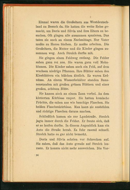 Einmal waren die Großeltern aus Westdeutschland zu Besuch da. Sie hatten die weite Reise gemacht, um Doris und Silvia und ihre Eltern zu besuchen. Oft gingen alle zusammen spazieren. Das taten sie auch an einem Nachmittage. Nur Vater mußte zu Hause bleiben. Er mußte arbeiten. Die Großeltern, die Mutter und die Kinder gingen zusammen weg. Auch Strolch durfte mit.