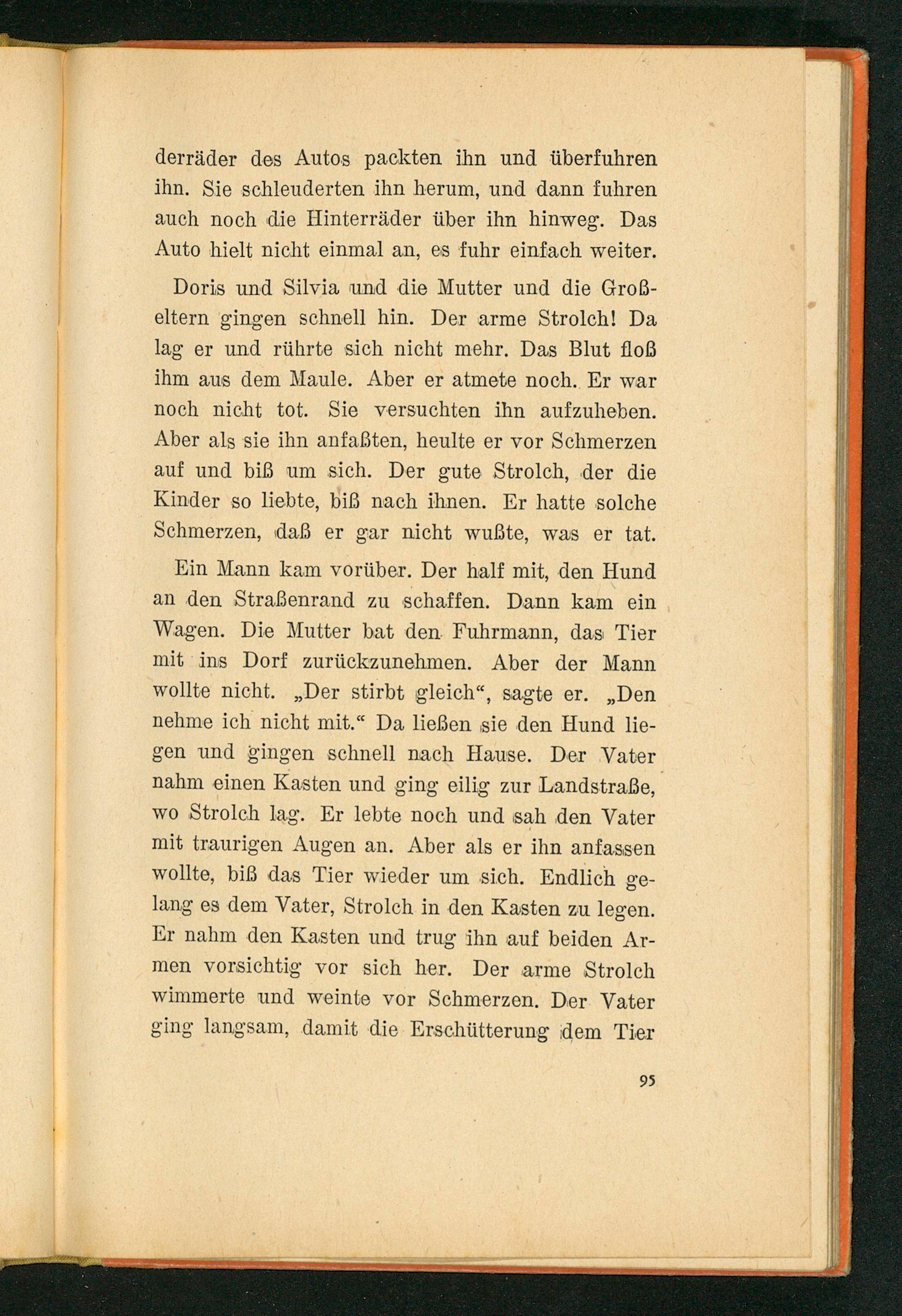 Doris und Silvia und die Mutter und die Großeltern gingen schnell hin. Der arme Strolch! Da lag er und rührte sich nicht mehr. Das Blut floẞ ihm aus dem Maule. Aber er atmete noch. Er war noch nicht tot. Sie versuchten ihn aufzuheben. Aber als sie ihn anfaßten, heulte er vor Schmerzen auf und biẞ um sich. Der gute Strolch, der die Kinder so liebte, biß nach ihnen. Er hatte solche Schmerzen, daß er gar nicht wußte, was er tat.