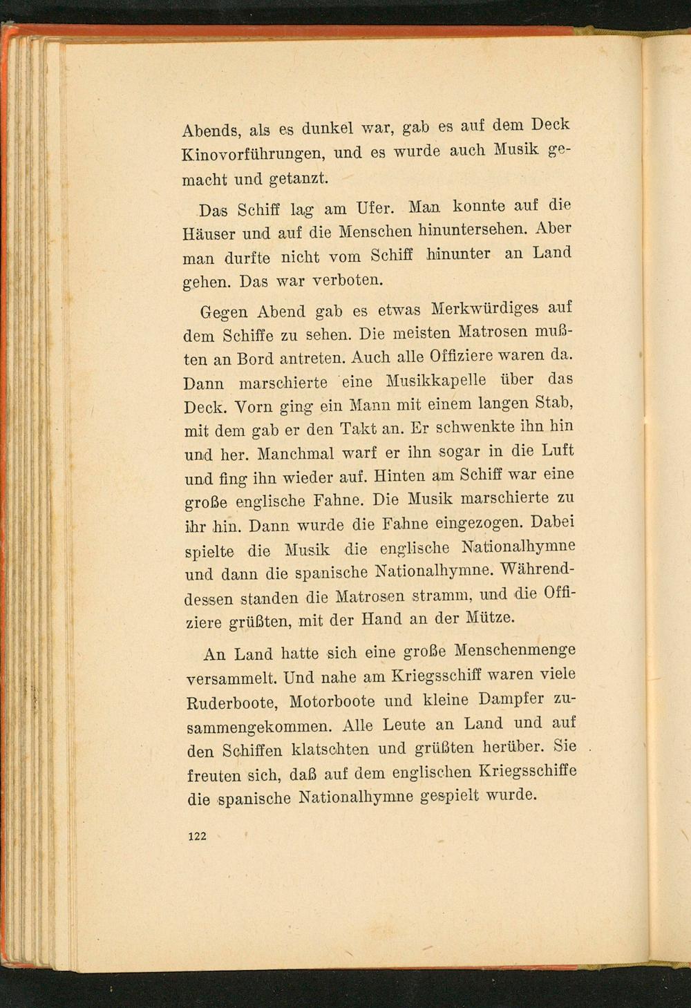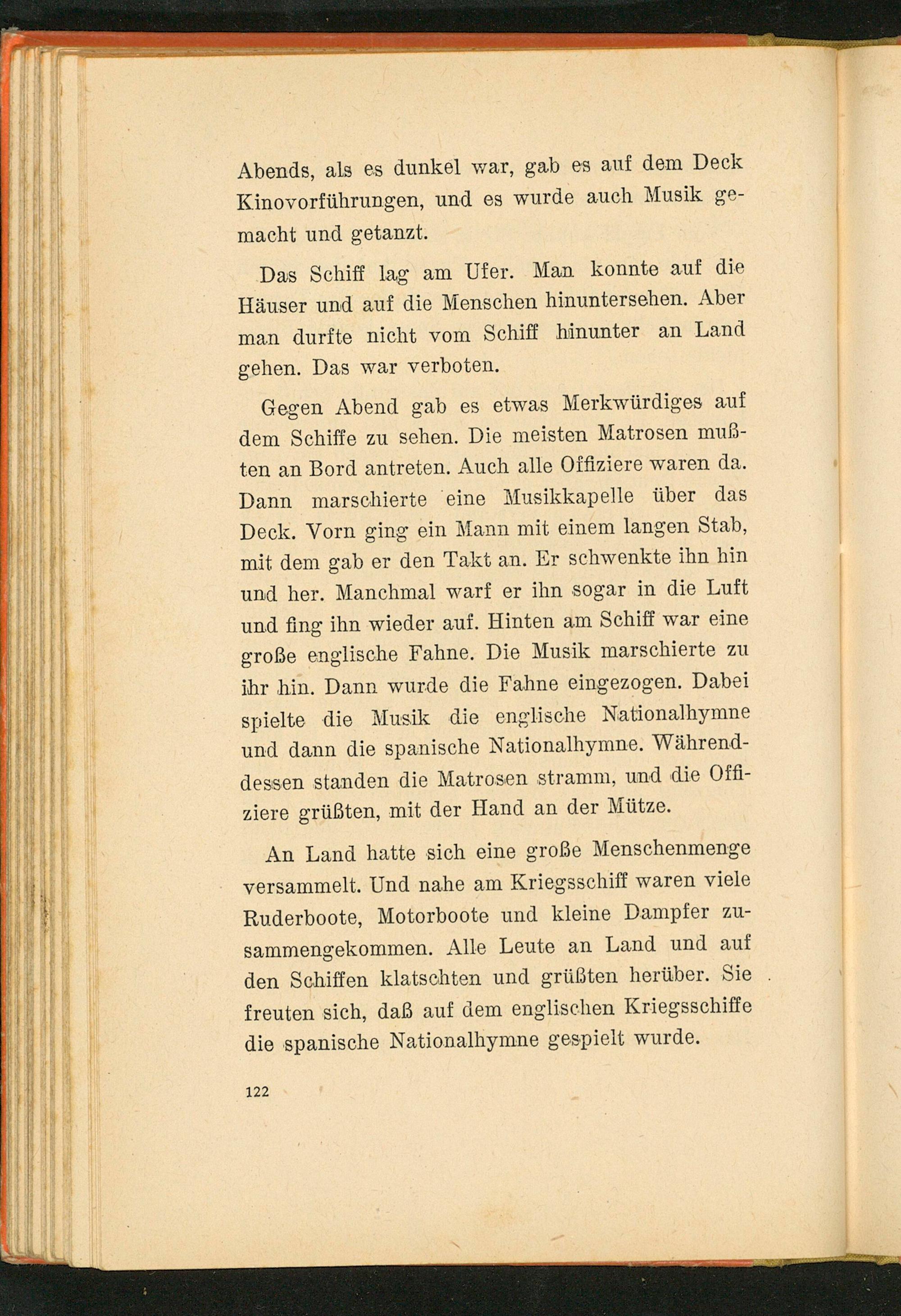Gegen Abend gab es etwas Merkwürdiges auf dem Schiffe zu sehen. Die meisten Matrosen muß- ten an Bord antreten. Auch alle Offiziere waren da. Dann marschierte‘eine Musikkapelle über das Deck. Vorn ging ein Mann mit einem langen Stab, mit dem gab er den Takt an. Er schwenkte ihn hin und her. Manchmal warf er ihn sogar in die Luft und fing ihn wieder auf. Hinten am Schiff war eine große englische Fahne. Die Musik marschierte zu ihr hin. Dann wurde die Fahne eingezogen. Dabei spielte die Musik die englische Nationalhymne und dann die spanische Nationalhymne. Während- dessen standen die Matrosen stramm, und die Offi- ziere grüßten, mit der Hand an der Mütze.