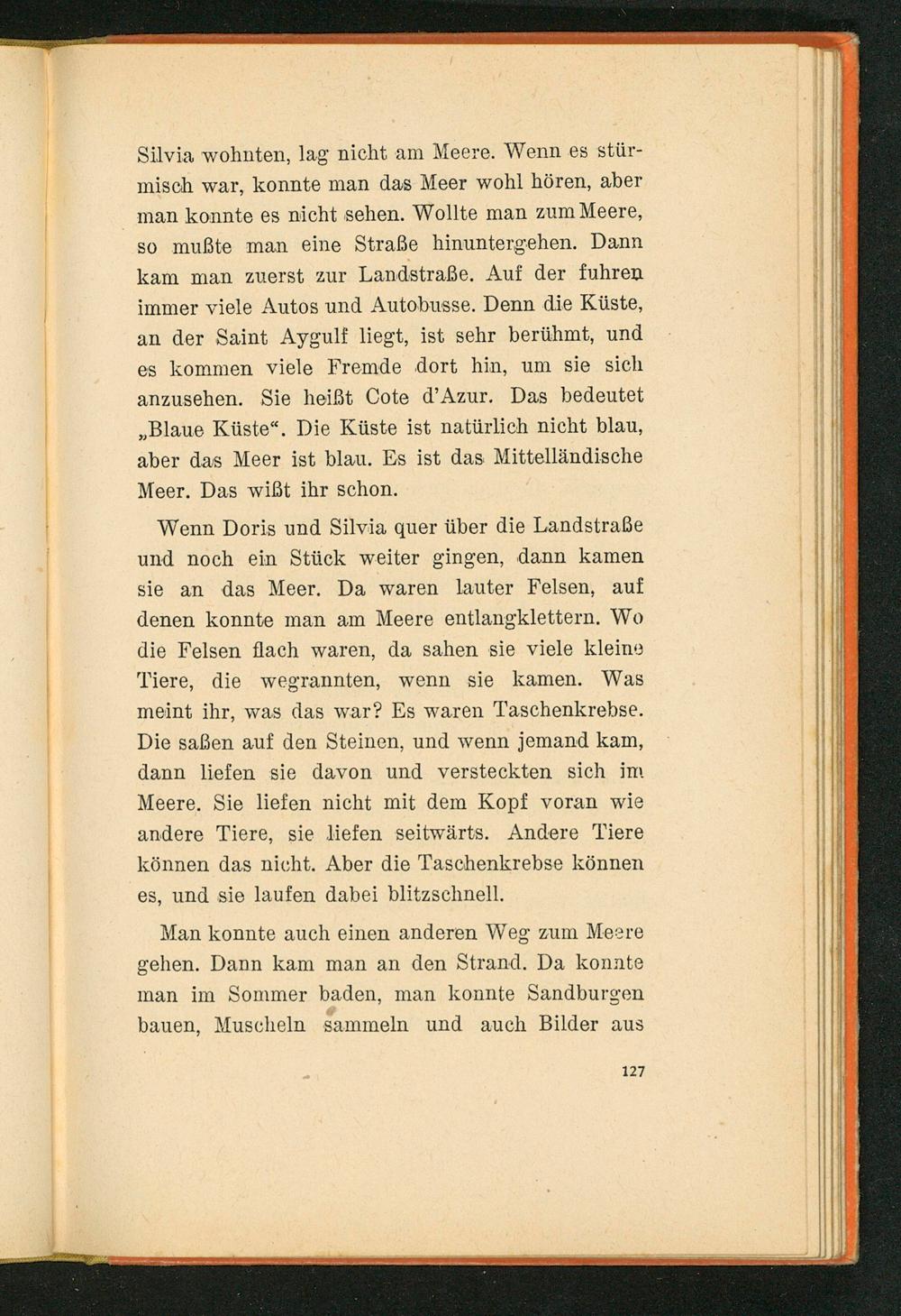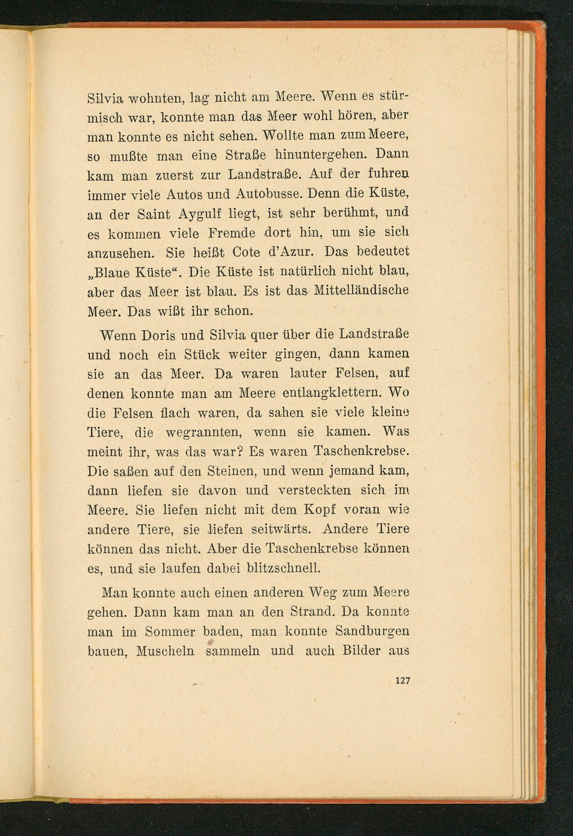 Silvia wohnten, lag nicht am Meere. Wenn es stür- misch war, konnte man das Meer wohl hören, aber man konnte es nicht sehen. Wollte man zum Meere, so mußte man eine Straße hinuntergehen. Dann kam man zuerst zur Landstraße. Auf der fuhren immer viele Autos und Autobusse. Denn die Küste, an der Saint Aygulf liegt, ist sehr berühmt, und es kommen viele Fremde dort hin, um sie sich anzusehen. Sie heißt Cote d’Azur . Das bedeutet „Blaue Küste“. Die Küste ist natürlich nicht blau, aber das Meer ist blau. Es ist das Mittelländische Meer. Das wißt ihr schon.
