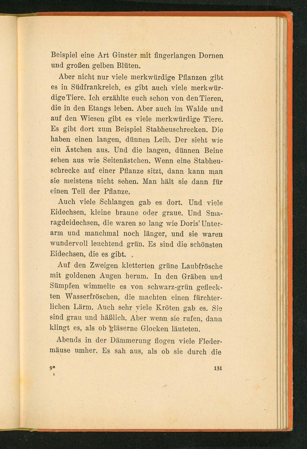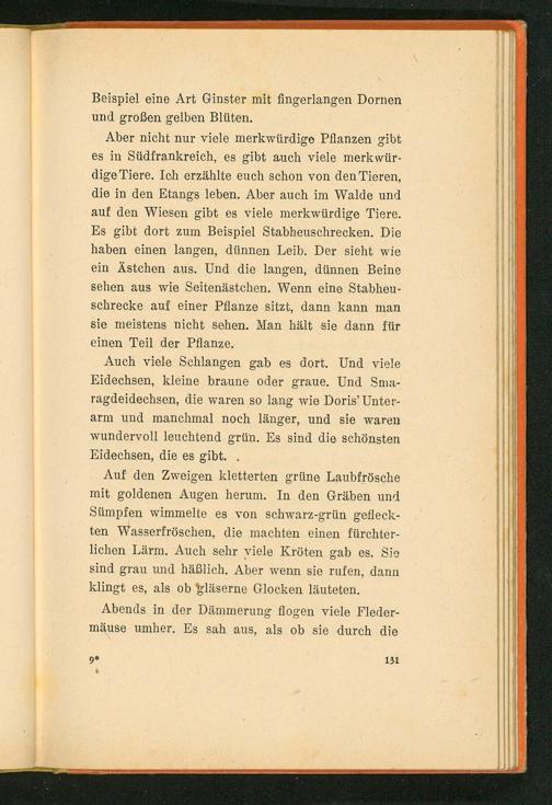 Auf den Zweigen kletterten grüne Laubfrösche mit goldenen Augen herum. In den Gräben und Sümpfen wimmelte es von schwarz- grün gefleckten Wasserfröschen, die machten einen fürchterlichen Lärm. Auch sehr viele Kröten gab es. Sie sind grau und häßlich. Aber wenn sie rufen, dann klingt es, als ob gläserne Glocken läuteten.