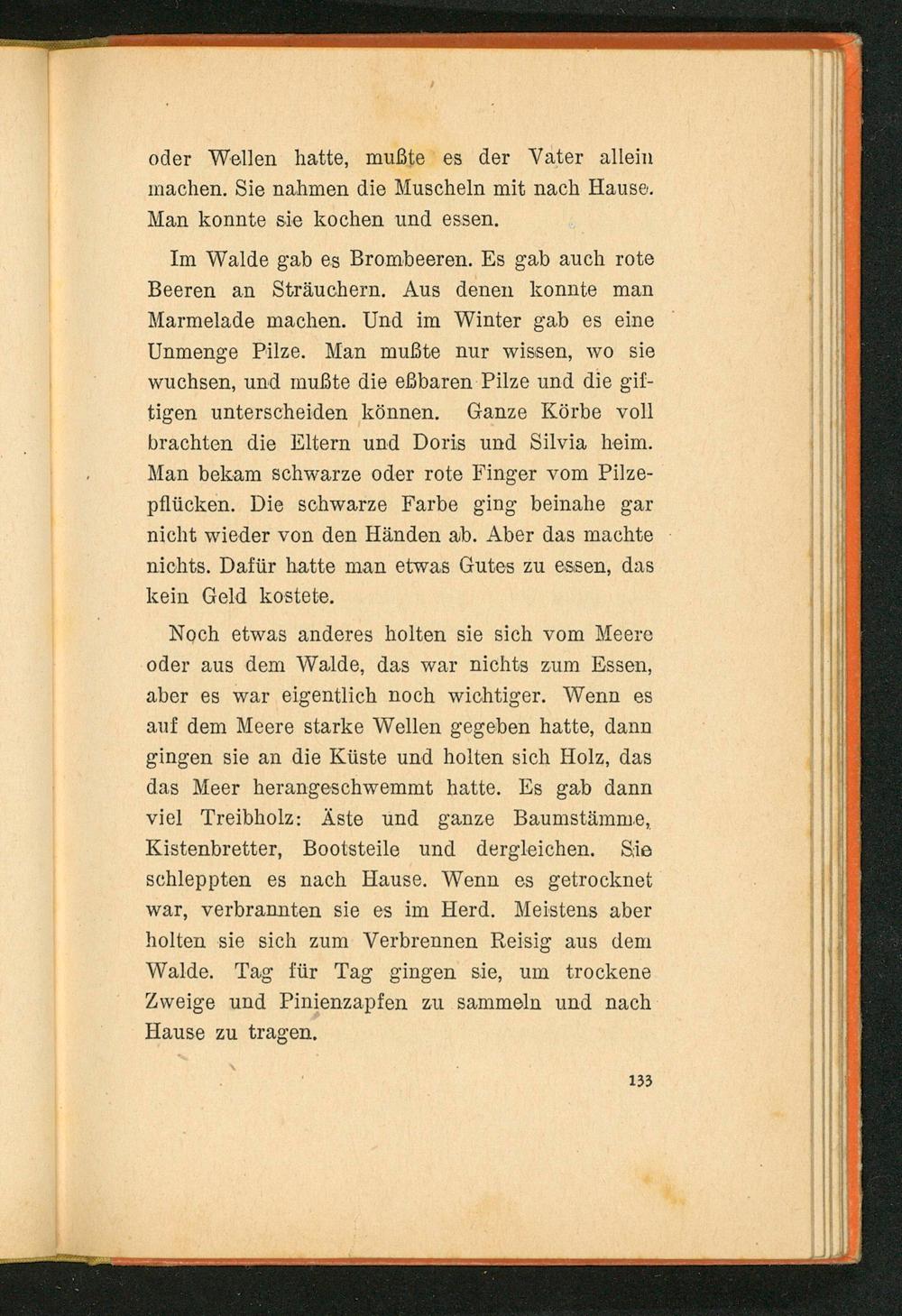 Im Walde gab es Brombeeren. Es gab auch rote Beeren an Sträuchern. Aus denen konnte man Marmelade machen. Und im Winter gab es eine Unmenge Pilze. Man mußte nur wissen, wo sie wuchsen, und mußte die eßbaren Pilze und die giftigen unterscheiden können. Ganze Körbe voll brachten die Eltern und Doris und Silvia heim. Man bekam schwarze oder rote Finger vom Pilzepflücken. Die schwarze Farbe ging beinahe gar nicht wieder von den Händen ab. Aber das machte nichts. Dafür hatte man etwas Gutes zu essen, das kein Geld kostete.
