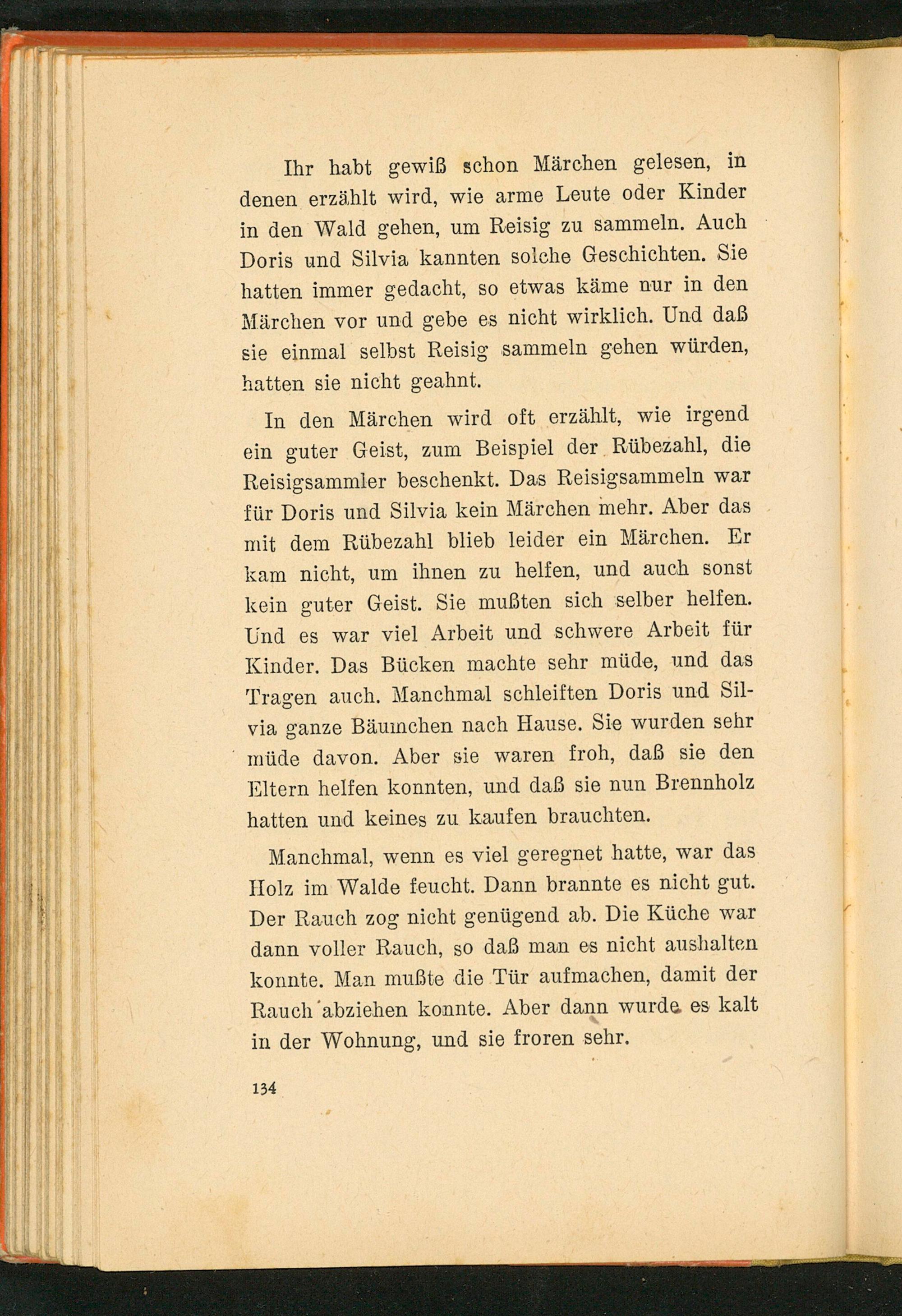 In den Märchen wird oft erzählt, wie irgend ein guter Geist, zum Beispiel der Rübezahl, die Reisigsammler beschenkt. Das Reisigsammeln war für Doris und Silvia kein Märchen mehr. Aber das mit dem Rübezahl blieb leider ein Märchen. Er kam nicht, um ihnen zu helfen, und auch sonst kein guter Geist. Sie mußten sich selber helfen. Und es war viel Arbeit und schwere Arbeit für Kinder. Das Bücken machte sehr müde, und das Tragen auch. Manchmal schleiften Doris und Silvia ganze Bäumchen nach Hause. Sie wurden sehr müde davon. Aber sie waren froh, daß sie den Eltern helfen konnten, und daß sie nun Brennholz hatten und keines zu kaufen brauchten.