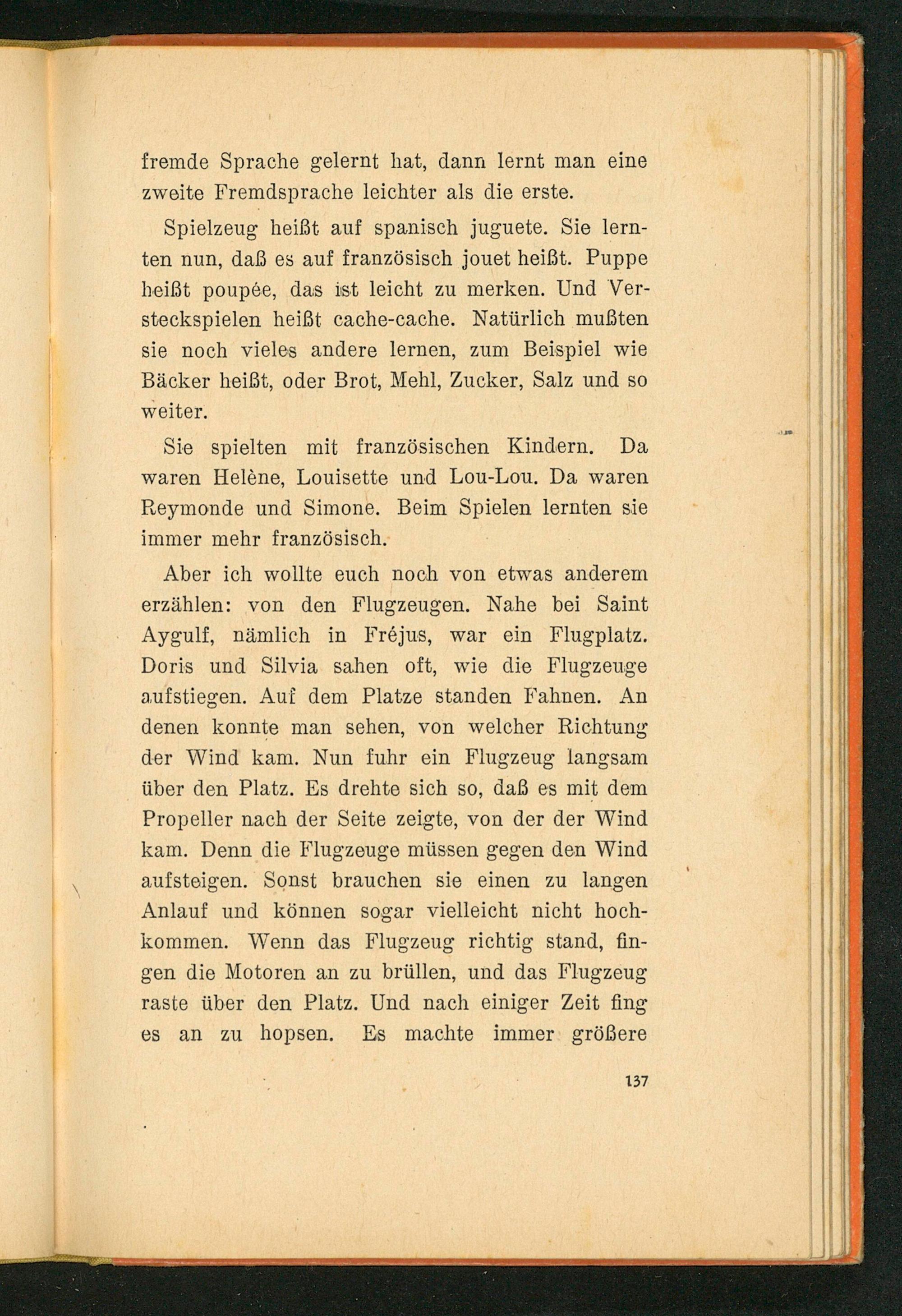 Aber ich wollte euch noch von etwas anderem erzählen: von den Flugzeugen. Nahe bei Saint Aygulf, nämlich in Freöjus, war ein Flugplatz. Doris und Silvia sahen oft, wie die Flugzeuge aufstiegen. Auf dem Platze standen Fahnen. An denen konnte man sehen, von welcher Richtung der Wind kam. Nun fuhr ein Flugzeug langsam über den Platz. Es drehte sich so, daß es mit dem Propeller nach der Seite zeigte, von der der Wind kam. Denn die Flugzeuge müssen gegen den Wind aufsteigen. Sonst brauchen sie einen zu langen Anlauf und können sogar vielleicht nicht hoch- kommen. Wenn das Flugzeug richtig stand, fin- gen die Motoren an zu brüllen, und das Flugzeug raste über den Platz. Und nach einiger Zeit fing es an zu hopsen. Es machte immer: größere