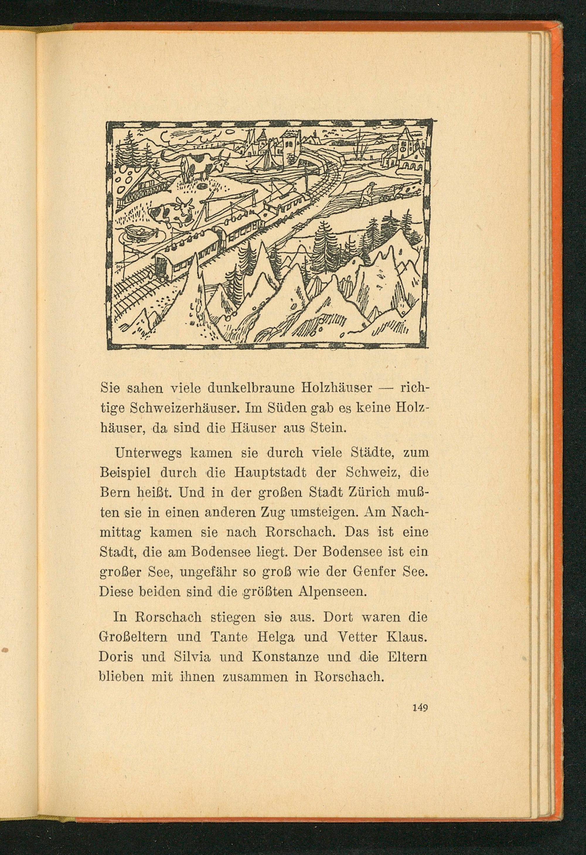 Unterwegs kamen sie durch viele Städte, zum Beispiel durch die Hauptstadt der Schweiz , die Bern heißt. Und in der großen Stadt Zürich muß- ten sie in einen anderen Zug umsteigen. Am Nach- mittag kamen sie nach Rorschach . Das ist eine Stadt, die am Bodensee liegt. Der Bodensee ist ein großer See, ungefähr so groß wie der Genfer See . Diese beiden sind die größten Alpenseen.