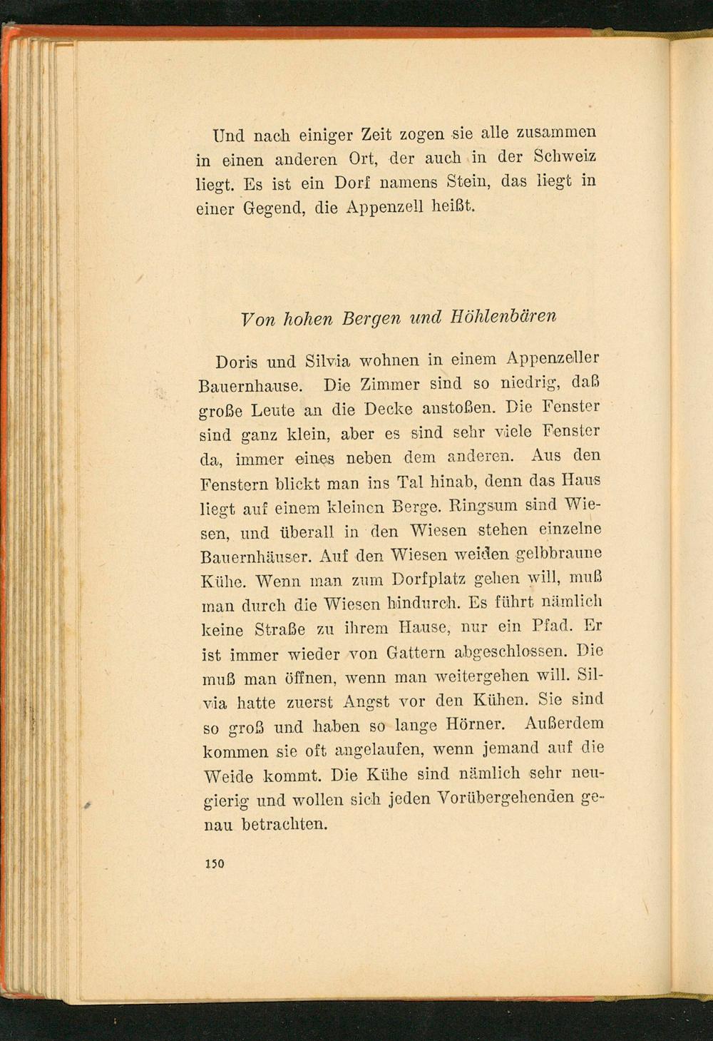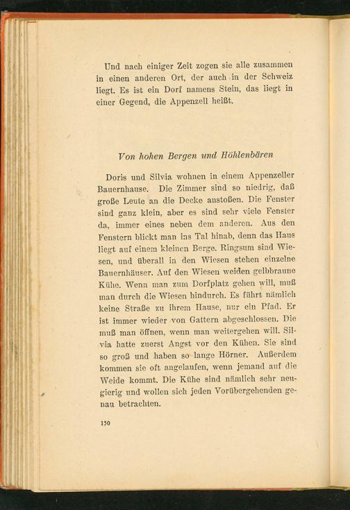 Doris und Silvia wohnen in einem Appenzeller Bauernhause. Die Zimmer sind so niedrig, daß große Leute an die Decke anstoßen. Die Fenster sind ganz klein, aber es sind sehr viele Fenster da, immer eines neben dem anderen. Aus den Fenstern blickt man ins Tal hinab, denn das Haus liegt auf einem kleinen Berge. Ringsum sind Wiesen, und überall in den Wiesen stehen einzelne Bauernhäuser. Auf den Wiesen weiden gelbbraune Kühe. Wenn man zum Dorfplatz gehen will, muß man durch die Wiesen hindurch. Es führt nämlich keine Straße zu ihrem Hause, nur ein Pfad. Er ist immer wieder von Gattern abgeschlossen. Die muß man öffnen, wenn man weitergehen will. Silvia hatte zuerst Angst vor den Kühen. Sie sind so groß und haben so lange Hörner. Außerdem kommen sie oft angelaufen, wenn jemand auf die Weide kommt. Die Kühe sind nämlich sehr neugierig und wollen sich jeden Vorübergehenden genau betrachten.