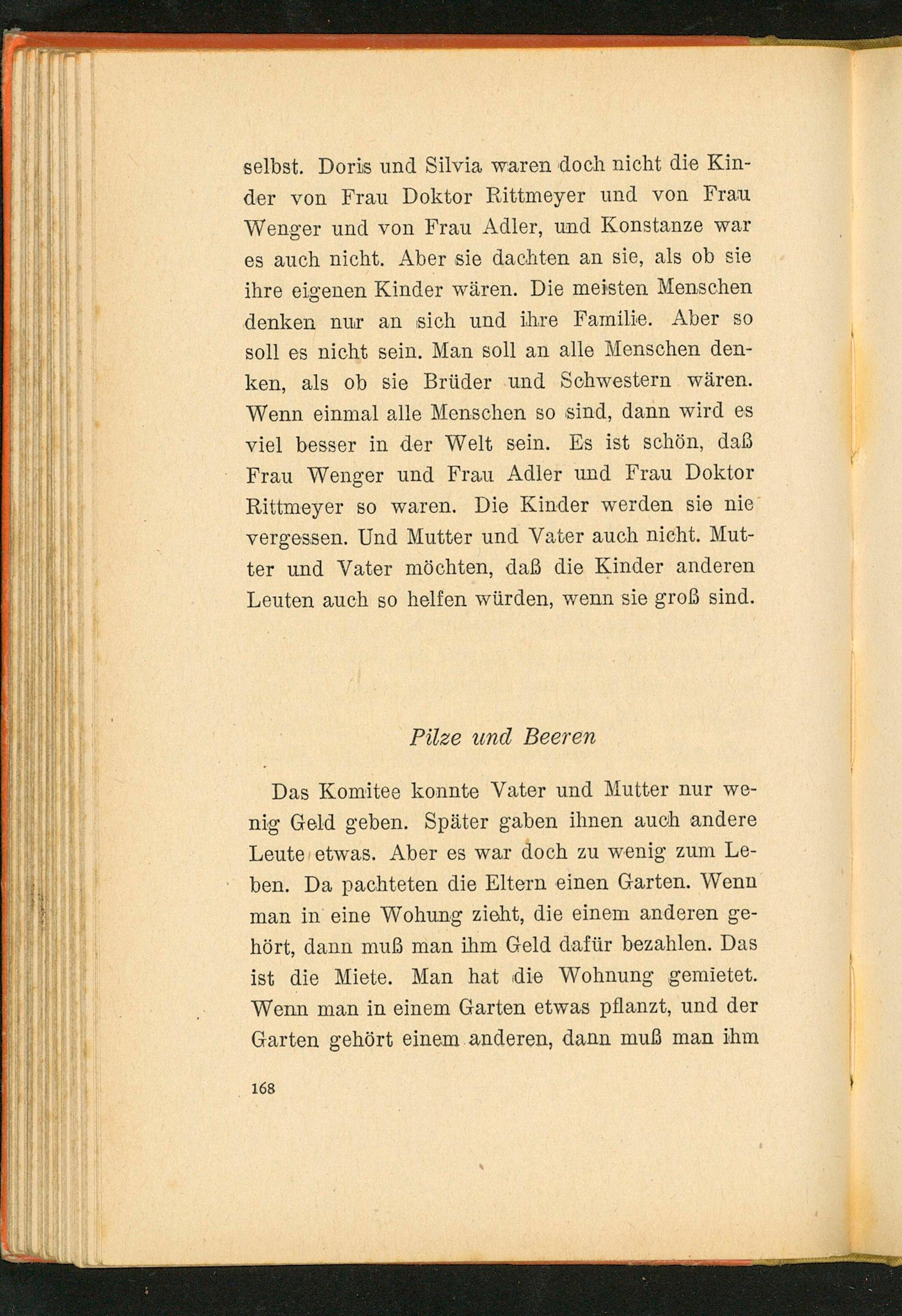 selbst. Doris und Silvia waren doch nicht die Kinder von Frau Doktor Rittmeyer und von Frau Wenger und von Frau Adler, und Konstanze war es auch nicht. Aber sie dachten an sie, als ob sie ihre eigenen Kinder wären. Die meisten Menschen denken nur an sich und ihre Familie. Aber so soll es nicht sein. Man soll an alle Menschen denken, als ob sie Brüder und Schwestern wären. Wenn einmal alle Menschen so sind, dann wird es viel besser in der Welt sein. Es ist schön, daß Frau Wenger und Frau Adler und Frau Doktor Rittmeyer so waren. Die Kinder werden sie nie vergessen. Und Mutter und Vater auch nicht. Mutter und Vater möchten, daß die Kinder anderen Leuten auch so helfen würden, wenn sie groß sind.