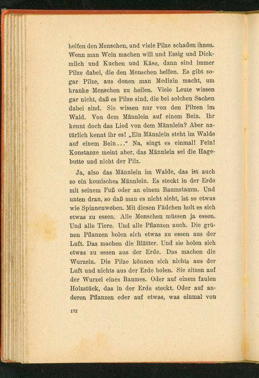 helfen den Menschen, und viele Pilze schaden ihnen. Wenn man Wein machen will und Essig und Dickmilch und Kuchen und Käse, dann sind immer Pilze dabei, die den Menschen helfen. Es gibt sogar Pilze, aus denen man Medizin macht, um kranke Menschen zu heilen. Viele Leute wissen gar nicht, daß es Pilze sind, die bei solchen Sachen dabei sind. Sie wissen nur von den Pilzen im Wald. Von dem Männlein auf einem Bein. Ihr kennt doch das Lied von dem Männlein? Aber natürlich kennt ihr es! ,, Ein Männlein steht im Walde auf einem Bein..." Na, singt es einmal! Fein! Konstanze meint aber, das Männlein sei die Hagebutte und nicht der Pilz.