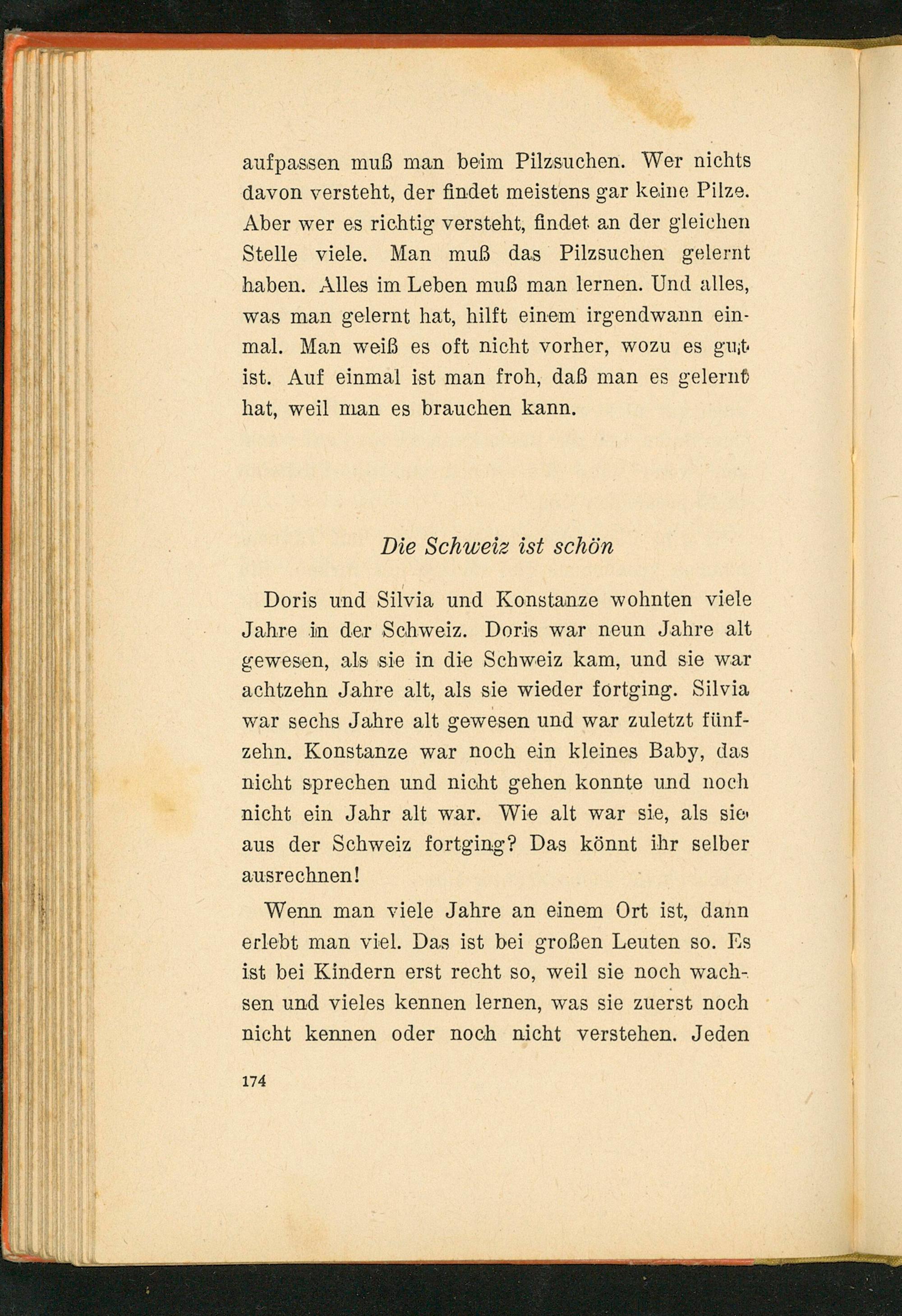 Doris und Silvia und Konstanze wohnten viele Jahre in der Schweiz . Doris war neun Jahre alt gewesen, als sie in die Schweiz kam, und sie war achtzehn Jahre alt, als sie wieder fortging. Silvia war sechs Jahre alt gewesen und war zuletzt fünfzehn. Konstanze war noch ein kleines Baby, das nicht sprechen und nicht gehen konnte und noch nicht ein Jahr alt war. Wie alt war sie, als sie aus der Schweiz fortging? Das könnt ihr selber ausrechnen!