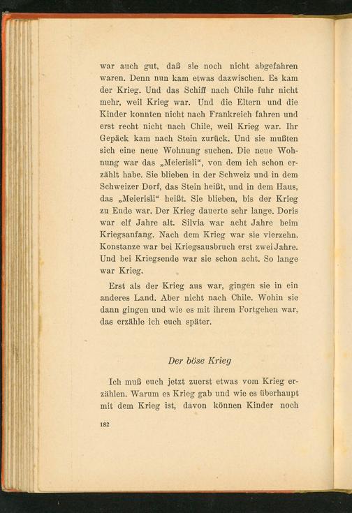 war auch gut, daß sie noch nicht abgefahren waren. Denn nun kam etwas dazwischen. Es kam der Krieg. Und das Schiff nach Chile fuhr nicht mehr, weil Krieg war. Und die Eltern und die Kinder konnten nicht nach Frankreich fahren und erst recht nicht nach Chile , weil Krieg war. Ihr Gepäck kam nach Stein zurück. Und sie mußten sich eine neue Wohnung suchen. Die neue Wohnung war das„ Meierisli", von dem ich schon erzählt habe. Sie blieben in der Schweiz und in dem Schweizer Dorf, das Stein heißt, und in dem Haus, das„ Meierisli" heißt. Sie blieben, bis der Krieg zu Ende war. Der Krieg dauerte sehr lange. Doris war elf Jahre alt. Silvia war acht Jahre beim Kriegsanfang. Nach dem Krieg war sie vierzehn. Konstanze war bei Kriegsausbruch erst zwei Jahre. Und bei Kriegsende war sie schon acht. So lange war Krieg.