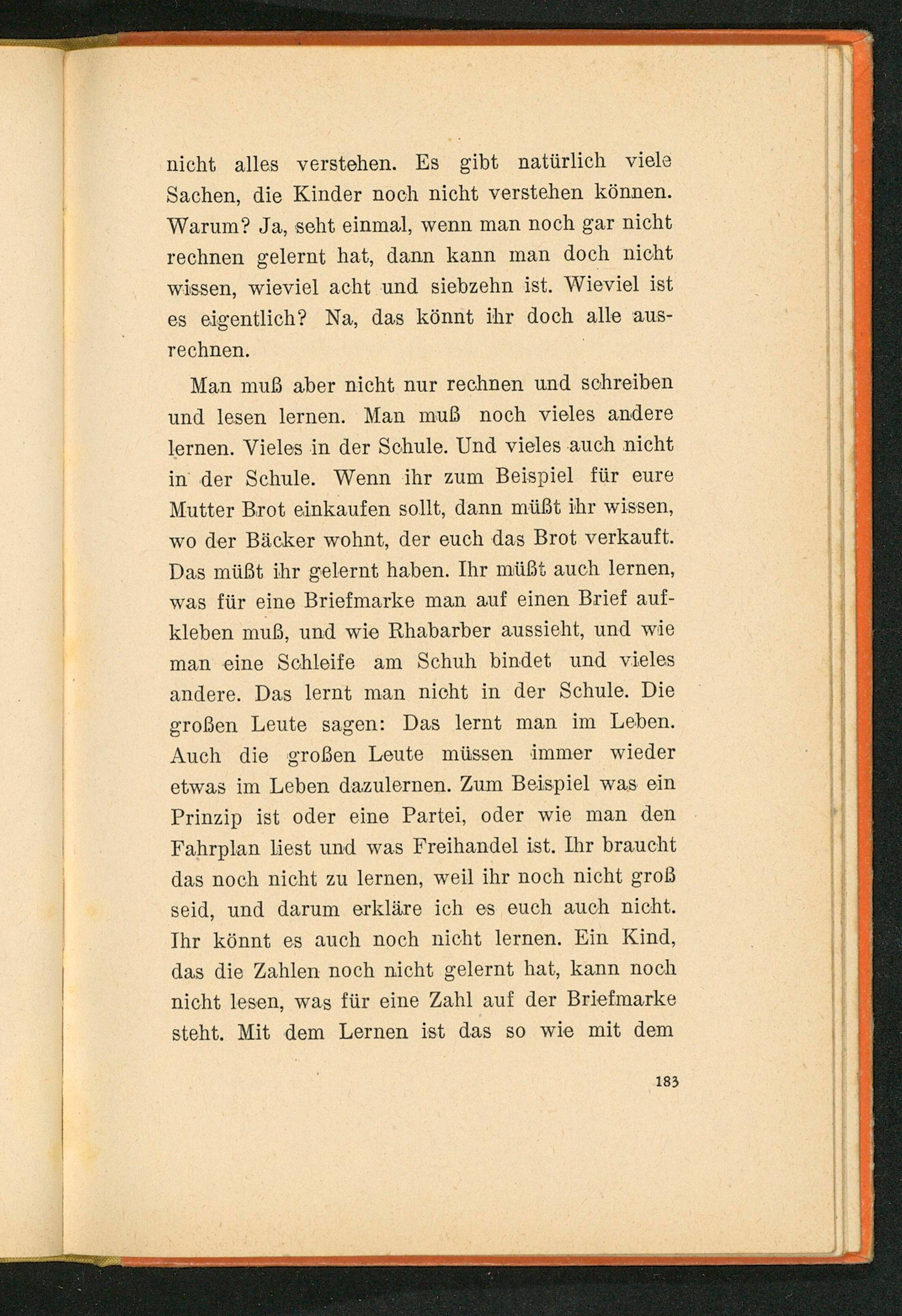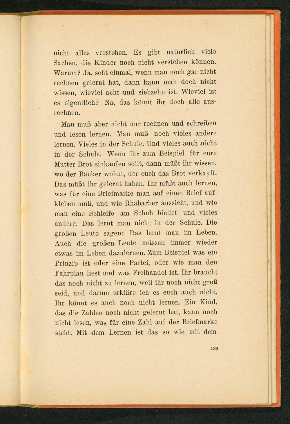 Man muß aber nicht nur rechnen und schreiben und lesen lernen. Man muß noch vieles andere lernen. Vieles in der Schule. Und vieles auch nicht in’ der Schule. Wenn ihr zum Beispiel für eure Mutter Brot einkaufen sollt, dann müßt ihr wissen, wo der Bäcker wohnt, der euch das Brot verkauft. Das müßt ihr gelernt haben. Ihr müßt auch lernen, was für eine Briefmarke man auf einen Brief auf- kleben muß, und wie Rhabarber aussieht, und wie man eine Schleife am Schuh bindet und vieles andere. Das lernt man nicht in der Schule. Die großen Leute sagen: Das lernt man im Leben. Auch die großen Leute müssen immer wieder etwas im Leben dazulernen. Zum Beispiel was ein Prinzip ist oder eine Partei, oder wie man den Fahrplan liest und was Freihandel ist. Ihr braucht das noch nicht zu lernen, weil ihr noch nicht groß seid, und darum erkläre ich es euch auch nicht. Ihr könnt es auch noch nicht lernen. Ein Kind, das die Zahlen noch nicht gelernt hat, kann noch nicht lesen, was für eine Zahl auf der Briefmarke steht. Mit dem Lernen ist das so wie mit dem