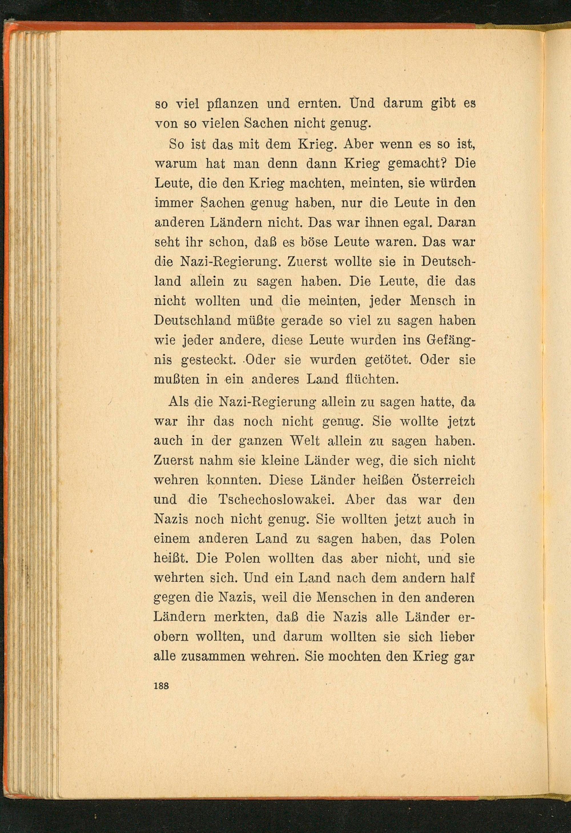 Als die Nazi- Regierung allein zu sagen hatte, da war ihr das noch nicht genug. Sie wollte jetzt auch in der ganzen Welt allein zu sagen haben. Zuerst nahm sie kleine Länder weg, die sich nicht wehren konnten. Diese Länder heißen Österreich und die Tschechoslowakei . Aber das war den Nazis noch nicht genug. Sie wollten jetzt auch in einem anderen Land zu sagen haben, das Polen heißt. Die Polen wollten das aber nicht, und sie wehrten sich. Und ein Land nach dem andern half gegen die Nazis, weil die Menschen in den anderen Ländern merkten, daß die Nazis alle Länder erobern wollten, und darum wollten sie sich lieber alle zusammen wehren. Sie mochten den Krieg gar