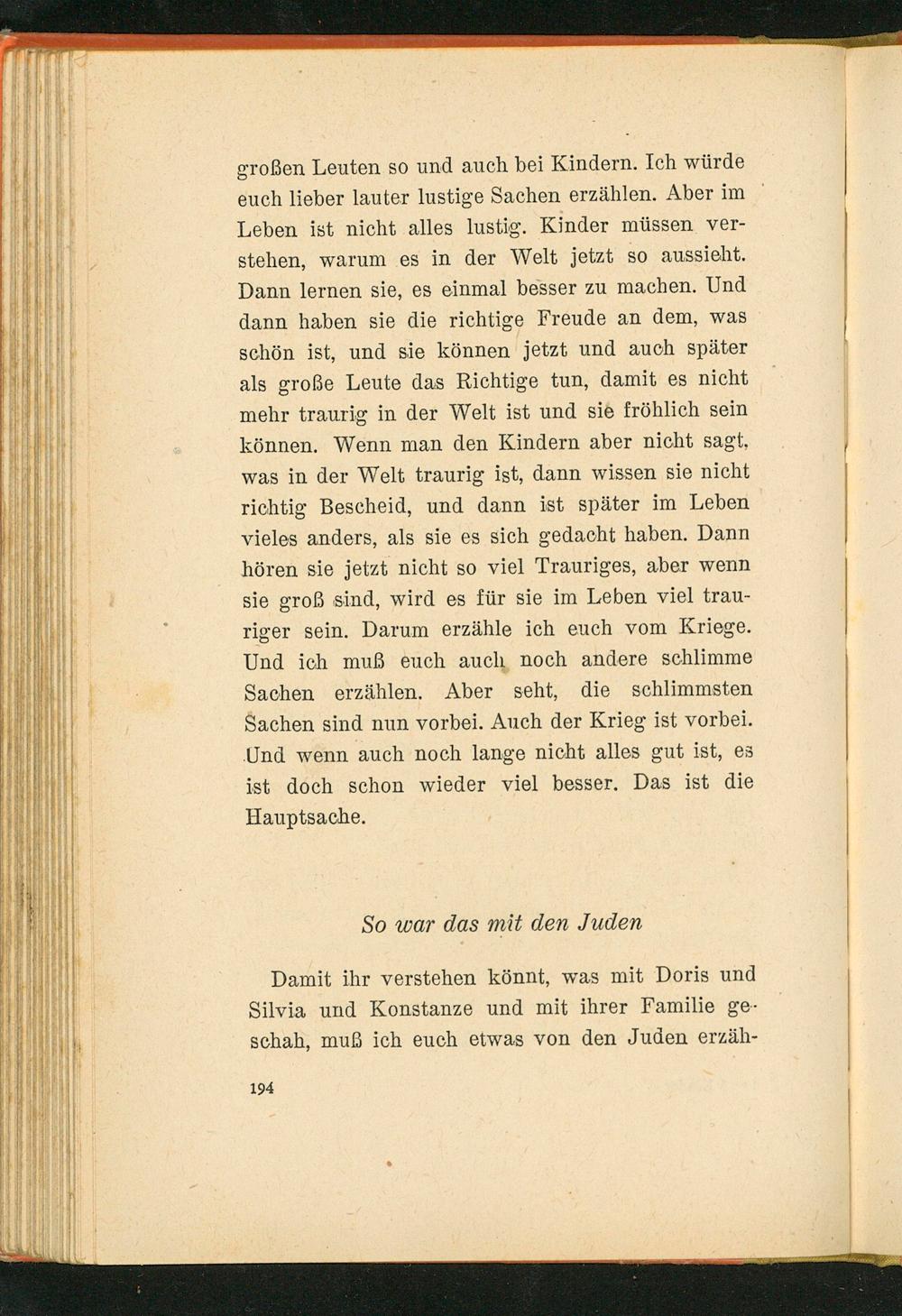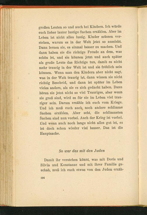 großen Leuten so und auch bei Kindern. Ich würde euch lieber lauter lustige Sachen erzählen. Aber im Leben ist nicht alles lustig. Kinder müssen verstehen, warum es in der Welt jetzt so aussieht. Dann lernen sie, es einmal besser zu machen. Und dann haben sie die richtige Freude an dem, was schön ist, und sie können jetzt und auch später als große Leute das Richtige tun, damit es nicht. mehr traurig in der Welt ist und sie fröhlich sein können. Wenn man den Kindern aber nicht sagt, was in der Welt traurig ist, dann wissen sie nicht richtig Bescheid, und dann ist später im Leben vieles anders, als sie es sich gedacht haben. Dann hören sie jetzt nicht so viel Trauriges, aber wenn sie groß sind, wird es für sie im Leben viel trauriger sein. Darum erzähle ich euch vom Kriege. Und ich muß euch auch noch andere schlimme Sachen erzählen. Aber seht, die schlimmsten. Sachen sind nun vorbei. Auch der Krieg ist vorbei. Und wenn auch noch lange nicht alles gut ist, es ist doch schon wieder viel besser. Das ist die Hauptsache.