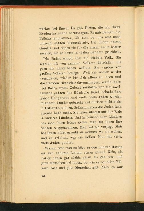 Die Juden waren aber ein kleines Volk. Sie wurden oft von anderen Völkern überfallen, die gern ihr Land haben wollten. Sie wurden von großen Völkern besiegt. Weil sie immer wieder versuchten, wieder für sich allein zu leben und die fremden Herrscher davonzujagen, wurde ihnen. viel Böses getan. Zuletzt zerstörte vor fast zweitausend Jahren das Römische Reich beinahe ihre ganze Hauptstadt, und viele, viele Juden wurden in andere Länder gebracht und durften nicht mehr in Palästina bleiben. Seitdem haben die Juden kein eigenes Land mehr. Sie leben überall auf der Erde in anderen Ländern. Und in beinahe allen Ländern hat man ihnen Böses getan. Man hat ihnen ihre Sachen weggenommen. Man hat sie verjagt. Man hat ihnen nicht erlaubt zu wohnen, wo sie wollen, und zu arbeiten, was sie wollen. Man hat viele, viele Juden getötet.