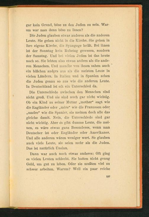 Die Unterschiede zwischen den Menschen sind nicht groß. Und sie sind auch gar nicht wichtig. Ob ein Kind zu seiner Mutter„mother“ sagt wie die Engländer oder„mere“ wie die Franzosen oder „madre“ wie die Spanier, sie meinen doch alle das gleiche damit. Nein, die Unterschiede'sind gar nicht wichtig. Aber es gibt dumme Leute, die mei- nen, es wäre etwas ganz Besonderes, wenn man Deutscher ist oder Engländer oder Amerikaner. Und alle anderen wären weniger wert. So glauben auch viele Leute, sie seien mehr als die Juden. Das ist natürlich Unsinn.