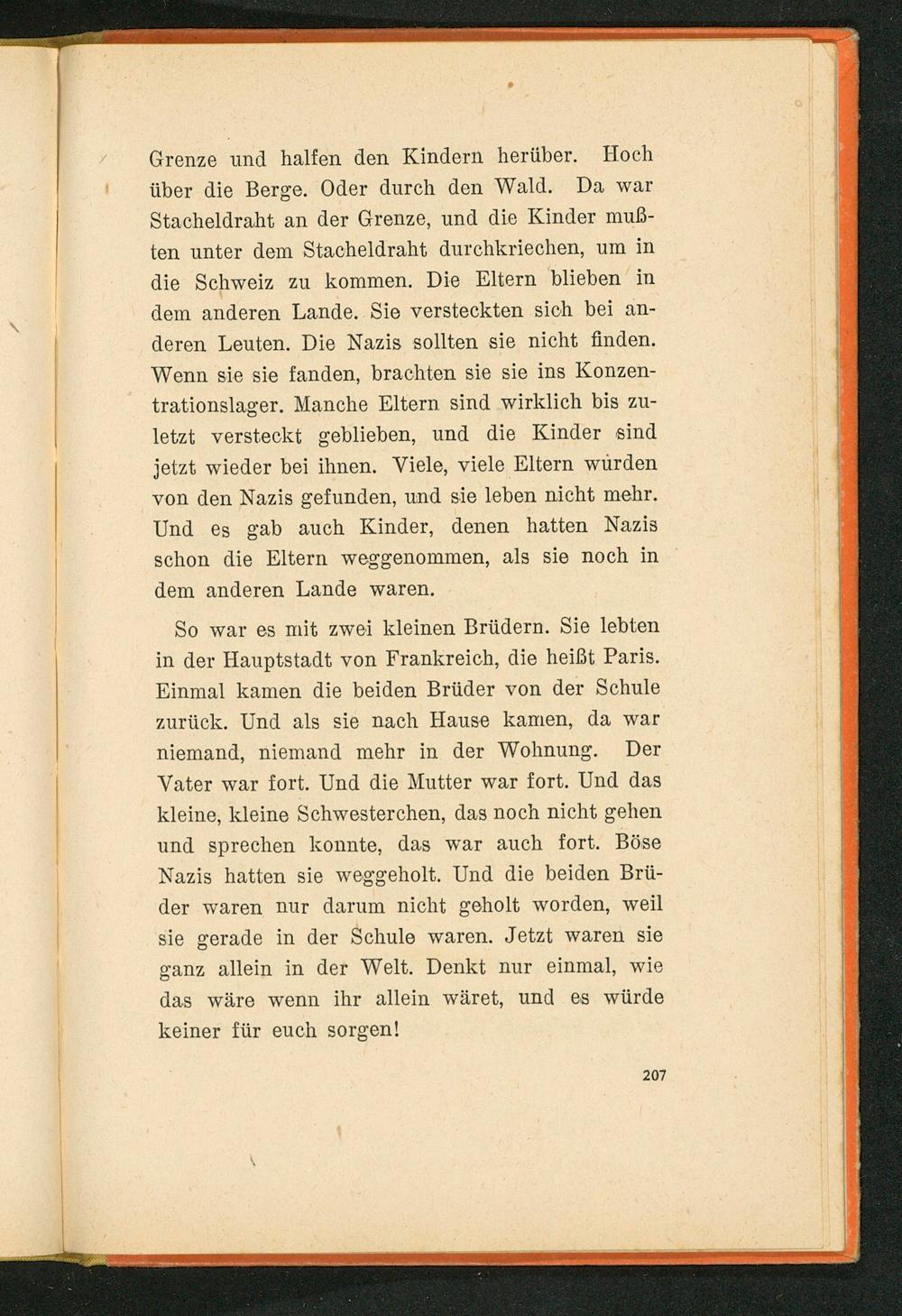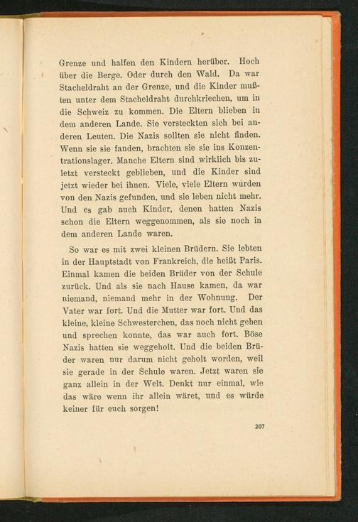 Grenze und halfen den Kindern herüber. Hoch über die Berge. Oder durch den Wald. Da war Stacheldraht an der Grenze, und die Kinder muß- ten unter dem Stacheldraht durchkriechen, um in die Schweiz zu kommen. Die Eltern blieben in dem anderen Lande. Sie versteckten sich bei an- deren Leuten. Die Nazis sollten sie nicht finden. Wenn sie sie fanden, brachten sie sie ins Konzen- trationslager. Manche Eltern sind wirklich bis zu- letzt versteckt geblieben, und die Kinder sind jetzt wieder bei ihnen. Viele, viele Eltern würden von den Nazis gefunden, und sie leben nicht mehr. Und es gab auch Kinder, denen hatten Nazis schon die Eltern weggenommen, als sie noch in dem anderen Lande waren.