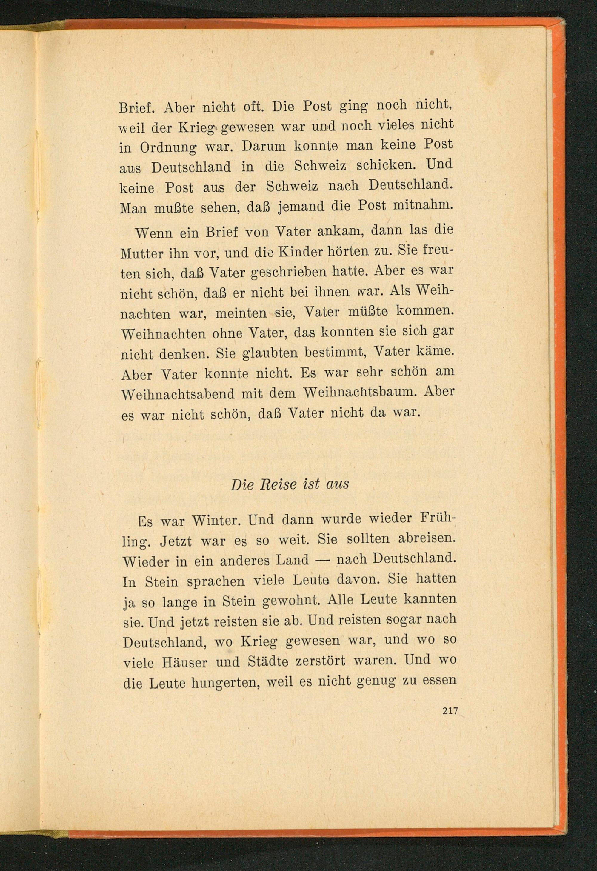 Es war Winter. Und dann wurde wieder Frühling. Jetzt war es so weit. Sie sollten abreisen. Wieder in ein anderes Land nach Deutschland . In Stein sprachen viele Leute davon. Sie hatten ja so lange in Stein gewohnt. Alle Leute kannten sie. Und jetzt reisten sie ab. Und reisten sogar nach Deutschland , wo Krieg gewesen war, und wo so viele Häuser und Städte zerstört waren. Und wo die Leute hungerten, weil es nicht genug zu essen