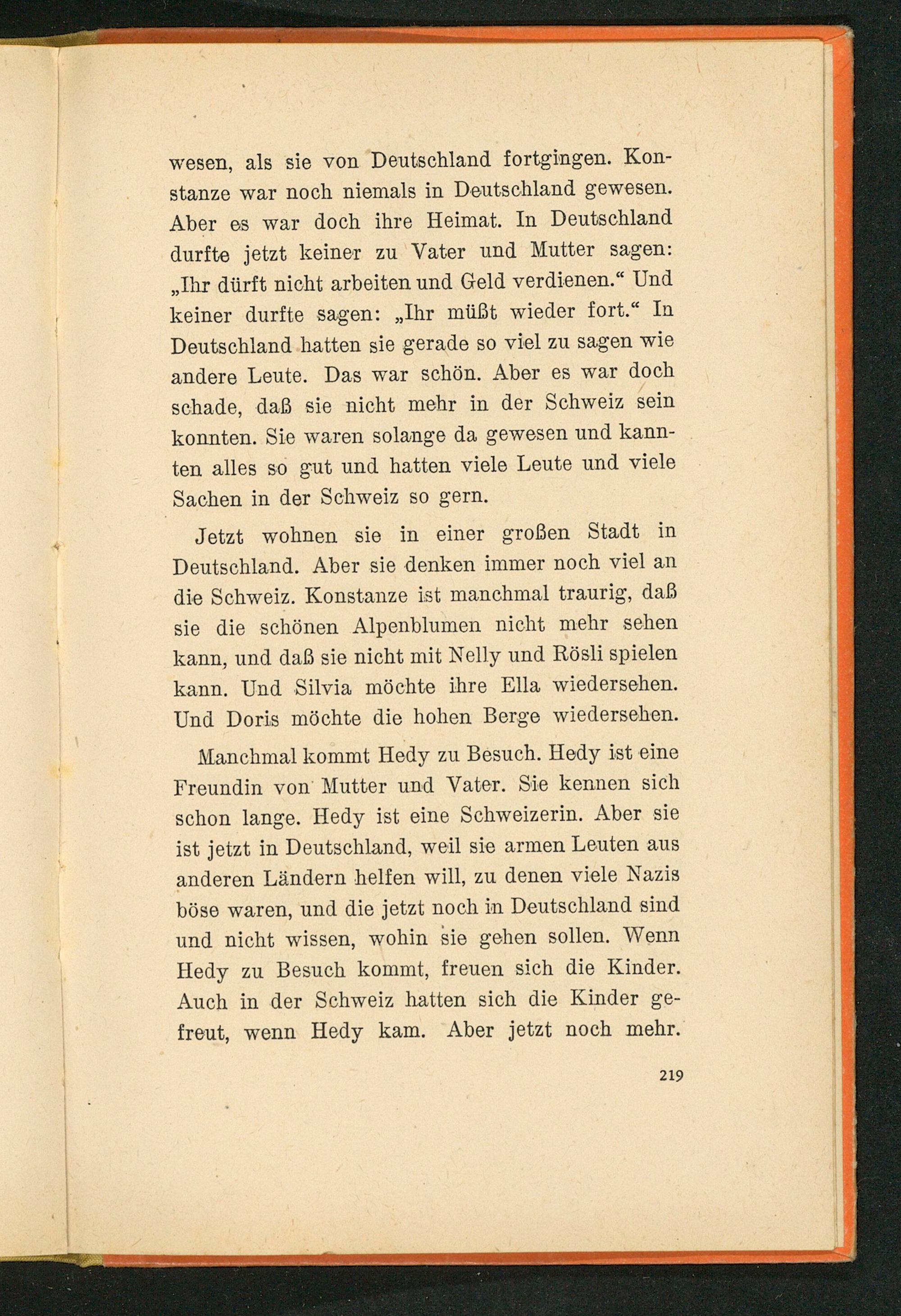 wesen, als sie von Deutschland fortgingen. Konstanze war noch niemals in Deutschland gewesen. Aber es war doch ihre Heimat. In Deutschland durfte jetzt keiner zu Vater und Mutter sagen: ,, Ihr dürft nicht arbeiten und Geld verdienen." Und keiner durfte sagen:„ Ihr müßt wieder fort." In Deutschland hatten sie gerade so viel zu sagen wie andere Leute. Das war schön. Aber es war doch schade, daß sie nicht mehr in der Schweiz sein konnten. Sie waren solange da gewesen und kannten alles so gut und hatten viele Leute und viele Sachen in der Schweiz so gern.