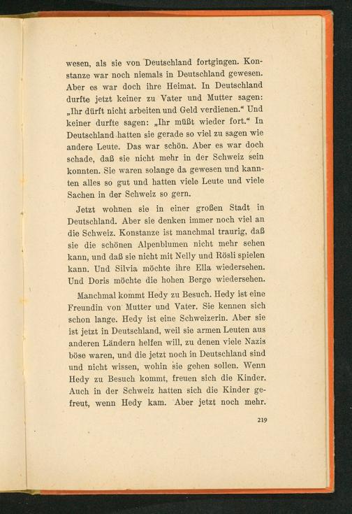 Manchmal kommt Hedy zu Besuch. Hedy ist eine Freundin von Mutter und Vater. Sie kennen sich schon lange. Hedy ist eine Schweizerin. Aber sie ist jetzt in Deutschland , weil sie armen Leuten aus anderen Ländern helfen will, zu denen viele Nazis böse waren, und die jetzt noch in Deutschland sind und nicht wissen, wohin sie gehen sollen. Wenn Hedy zu Besuch kommt, freuen sich die Kinder. Auch in der Schweiz hatten sich die Kinder gefreut, wenn Hedy kam. Aber jetzt noch mehr.
