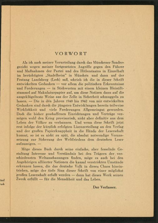 Als ich nach meiner Verurteilung durch das Münchener Sondergericht wegen meiner fortgesetzten Angriffe gegen den Führer und Maßnahmen der Partei und des Hitlerstaates in Einzelhaft im berüchtigten Stadelheim" in München und dann auf der Festung Landsberg ( Lech) saß, schrieb ich die in dieser Schrift entwickelten Gedanken vor allem die politischen Erkenntnisse und Forderungen in Stichworten mit einem kleinen Bleistiftstummel auf Makulaturpapier auf, um diese Notizen dann auf die ausgeklügelteste Weise aus der Zelle in Sicherheit schmuggeln zu lassen. Die in den Jahren 1940 bis 1942 von mir entwickelten Gedanken sind durch die jüngsten Entwicklungen bereits teilweise Wirklichkeit und viele Forderungen Allgemeingut geworden. Doch die bisher geschaffenen Einrichtungen und Verträge vermögen wohl den Krieg provisorisch, nicht aber definitiv aus dem Leben der Völker zu verbannen. Und wenn diese Schrift jetzt erst infolge der kürzlich erfolgten Lizenzerteilung an den Verlag und der großen Papierknappheit in die Hände der Leserschaft kommt, so ist es nicht zu spät, die absolut notwendige Voraussetzung zur Sicherung des Weltfriedens dem deutschen Leser aufzuzeigen.