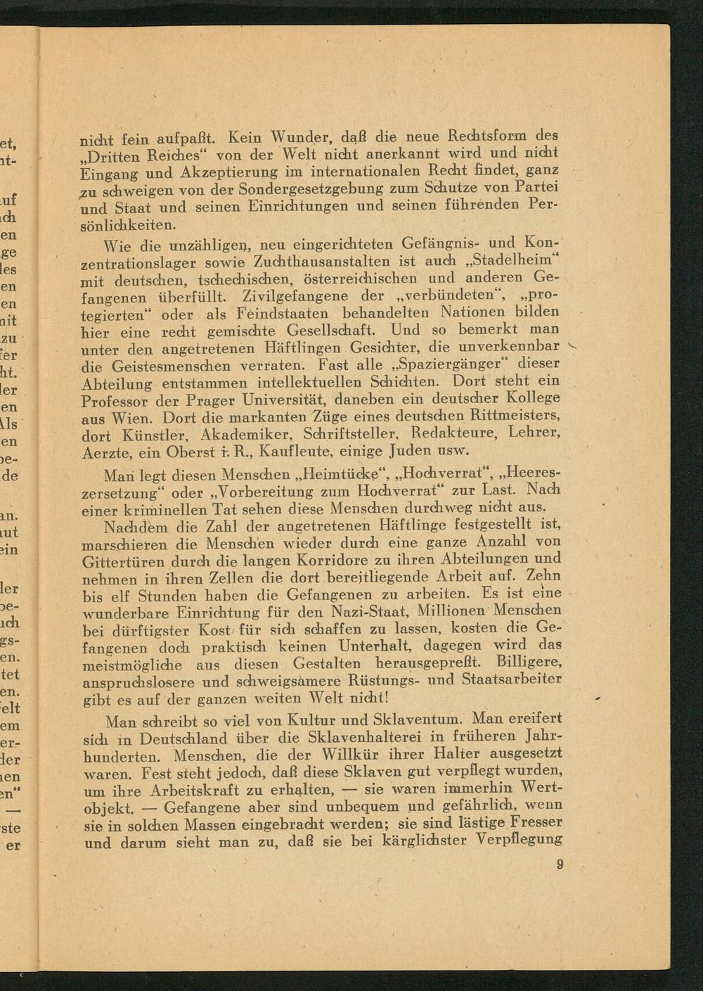 Wie die unzähligen, neu eingerichteten Gefängnis- und Kon- zentrationslager sowie Zuchthausanstalten ist auch„Stadelheim “ mit deutschen, tschechischen, österreichischen und anderen Ge- fangenen überfüllt. Zivilgefangene der„verbündeten“,„pro- tegierten“ oder als Feindstaaten behandelten Nationen bilden hier eine recht gemischte Gesellschaft. Und so bemerkt man unter den angetretenen Häftlingen Gesichter, die unverkennbar‘ die Geistesmenschen verraten. Fast alle„Spaziergänger“ dieser Abteilung entstammen intellektuellen Schichten. Dort steht ein Professor der Prager Universität, daneben ein deutscher Kollege aus Wien . Dort die markanten Züge eines deutschen Rittmeisters, dort Künstler, Akademiker, Schriftsteller, Redakteure, Lehrer, Aerzte, ein Oberst i. R., Kaufleute, einige Juden usw.