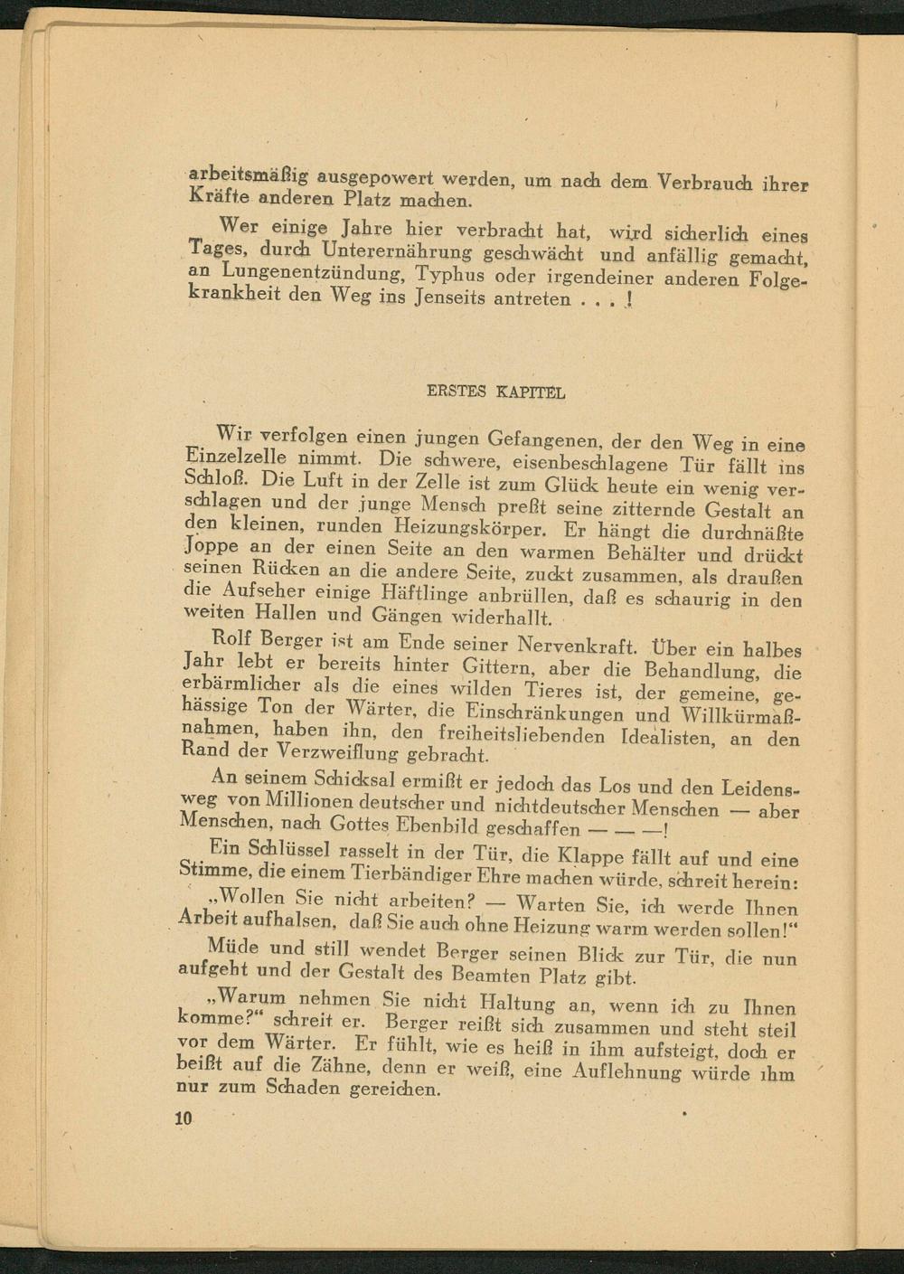 Ein Schlüssel rasselt in der Tür, die Klappe fällt auf und eine Stimme, die einem Tierbändiger Ehre machen würde, schreit herein: ,, Wollen Sie nicht arbeiten? Warten Sie, ich werde Ihnen Arbeit aufhalsen, daß Sie auch ohne Heizung warm werden sollen!" Müde und still wendet Berger seinen Blick zur Tür, die nun aufgeht und der Gestalt des Beamten Platz gibt.