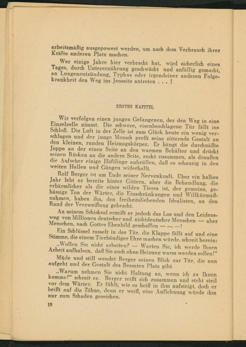 ,, Warum nehmen Sie nicht Haltung an, wenn ich zu Ihnen komme?" schreit er. Berger reißt sich zusammen und steht steil vor dem Wärter. Er fühlt, wie es heiß in ihm aufsteigt, doch er beißt auf die Zähne, denn er weiß, eine Auflehnung würde ihm nur zum Schaden gereichen.