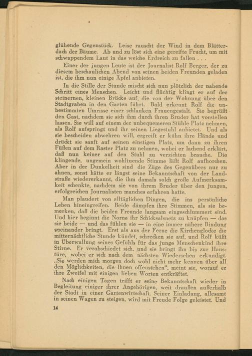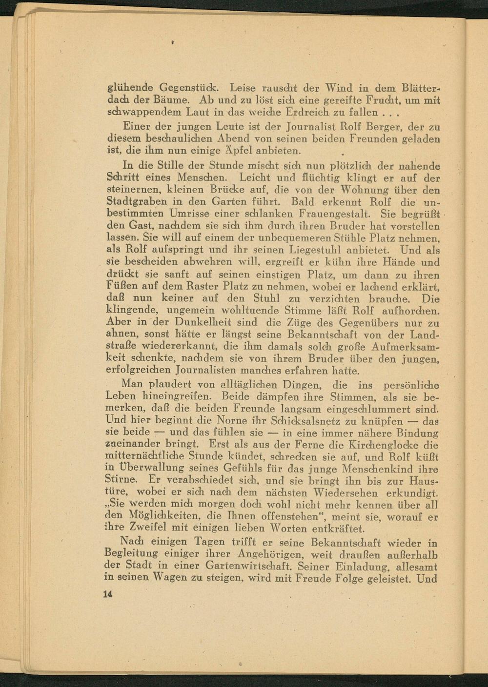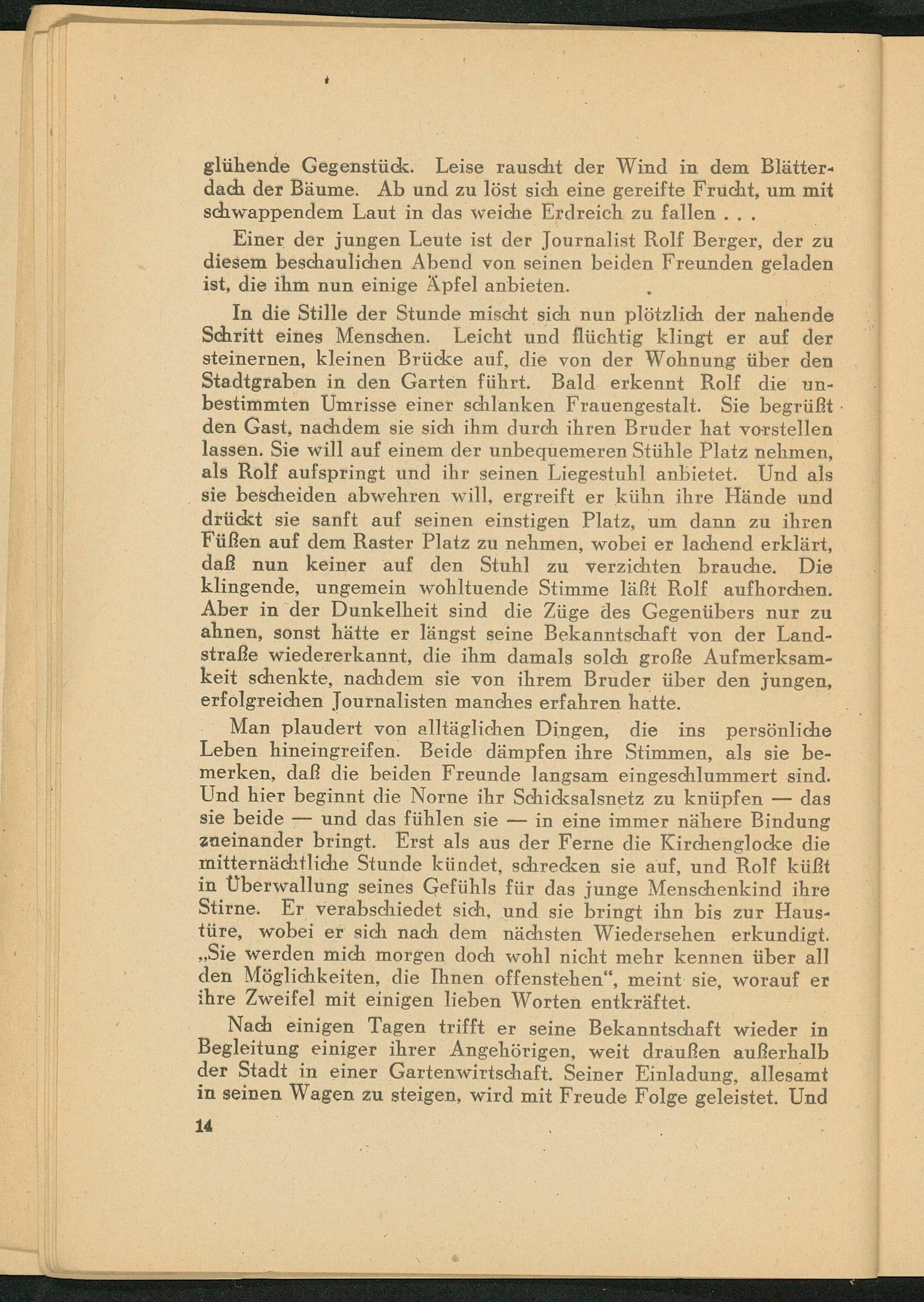 In die Stille der Stunde mischt sich nun plötzlich der nahende Schritt eines Menschen. Leicht und flüchtig klingt er auf der steinernen, kleinen Brücke auf, die von der Wohnung über den Stadtgraben in den Garten führt. Bald erkennt Rolf die unbestimmten Umrisse einer schlanken Frauengestalt. Sie begrüßt den Gast, nachdem sie sich ihm durch ihren Bruder hat vorstellen lassen. Sie will auf einem der unbequemeren Stühle Platz nehmen, als Rolf aufspringt und ihr seinen Liegestuhl anbietet. Und als sie bescheiden abwehren will, ergreift er kühn ihre Hände und drückt sie sanft auf seinen einstigen Platz, um dann zu ihren Füßen auf dem Raster Platz zu nehmen, wobei er lachend erklärt, daß nun keiner auf den Stuhl zu verzichten brauche. Die klingende, ungemein wohltuende Stimme läßt Rolf aufhorchen. Aber in der Dunkelheit sind die Züge des Gegenübers nur zu ahnen, sonst hätte er längst seine Bekanntschaft von der Landstraße wiedererkannt, die ihm damals solch große Aufmerksamkeit schenkte, nachdem sie von ihrem Bruder über den jungen, erfolgreichen Journalisten manches erfahren hatte.