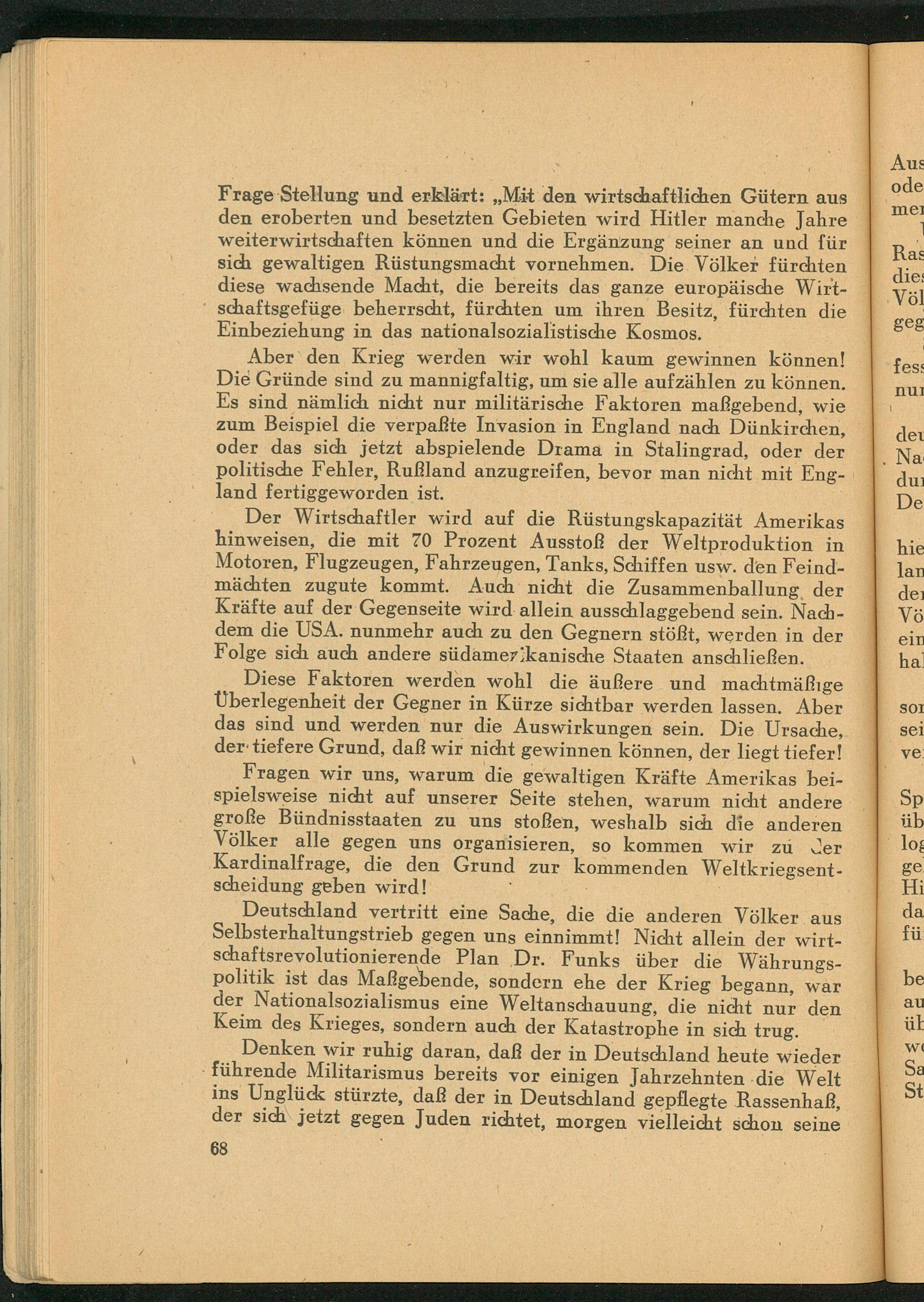 Frage Stellung und erklärt:„Mit den wirtschaftlichen Gütern aus den eroberten und besetzten Gebieten wird Hitler manche Jahre weiterwirtschaften können und die Ergänzung seiner an und für sich gewaltigen Rüstungsmacht vornehmen. Die Völker fürchten diese wachsende Macht, die bereits das ganze europäische Wirt- schaftsgefüge beherrscht, fürchten um ihren Besitz, fürchten die Einbeziehung in das nationalsozialistische Kosmos.