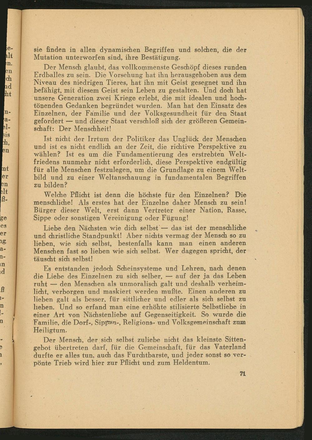 Welche Pflicht ist denn die höchste für den Einzelnen? Die menschliche! Als erstes hat der Einzelne daher Mensch zu sein! Bürger dieser Welt, erst dann Vertreter einer Nation, Rasse, Sippe oder sonstigen Vereinigung oder Fügung!