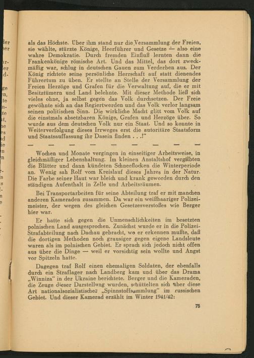 Dagegen traf Rolf einen ehemaligen Soldaten, der ebenfalls durch ein Straflager nach Landberg kam und über das Drama ,, Winniza" in der Ukraine berichtete. Berger und die Kameraden, die Zeuge dieser Darstellung wurden, schüttelten sich aber diese Art nationalsozialistische Spinnstoffsammlung" im russischen Gebiet. Und dieser Kamerad erzählt im Winter 1941/42: