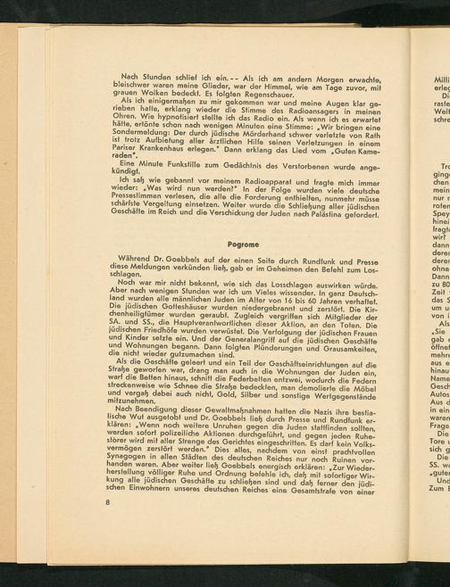 Noch war mir nicht bekannt, wie sich das Losschlagen auswirken würde. Aber nach wenigen Stunden war ich um Vieles wissender. In ganz Deutschland wurden alle männlichen Juden im Alter von 16 bis 60 Jahren verhaftet. Die jüdischen Gotteshäuser wurden niedergebrannt und zerstört. Die Kirchenheiligtümer wurden geraubt. Zugleich vergriffen sich Mitglieder der SA. und SS., die Hauptverantwortlichen dieser Aktion, an den Toten. Die jüdischen Friedhöfe wurden verwüstet. Die Verfolgung der jüdischen Frauen und Kinder setzte ein. Und der Generalangriff auf die jüdischen Geschäfte und Wohnungen begann. Dann folgten Plünderungen und Grausamkeiten, die nicht wieder gutzumachen sind.