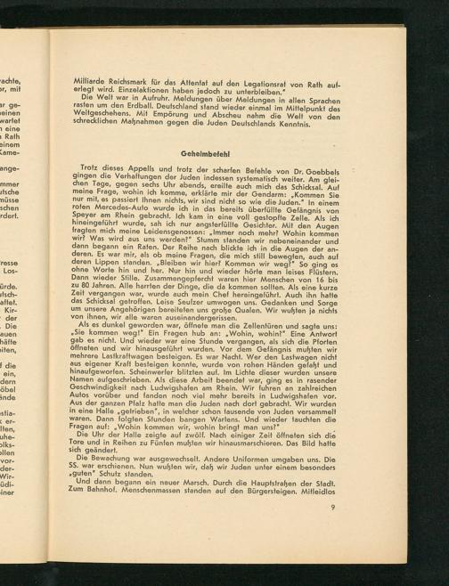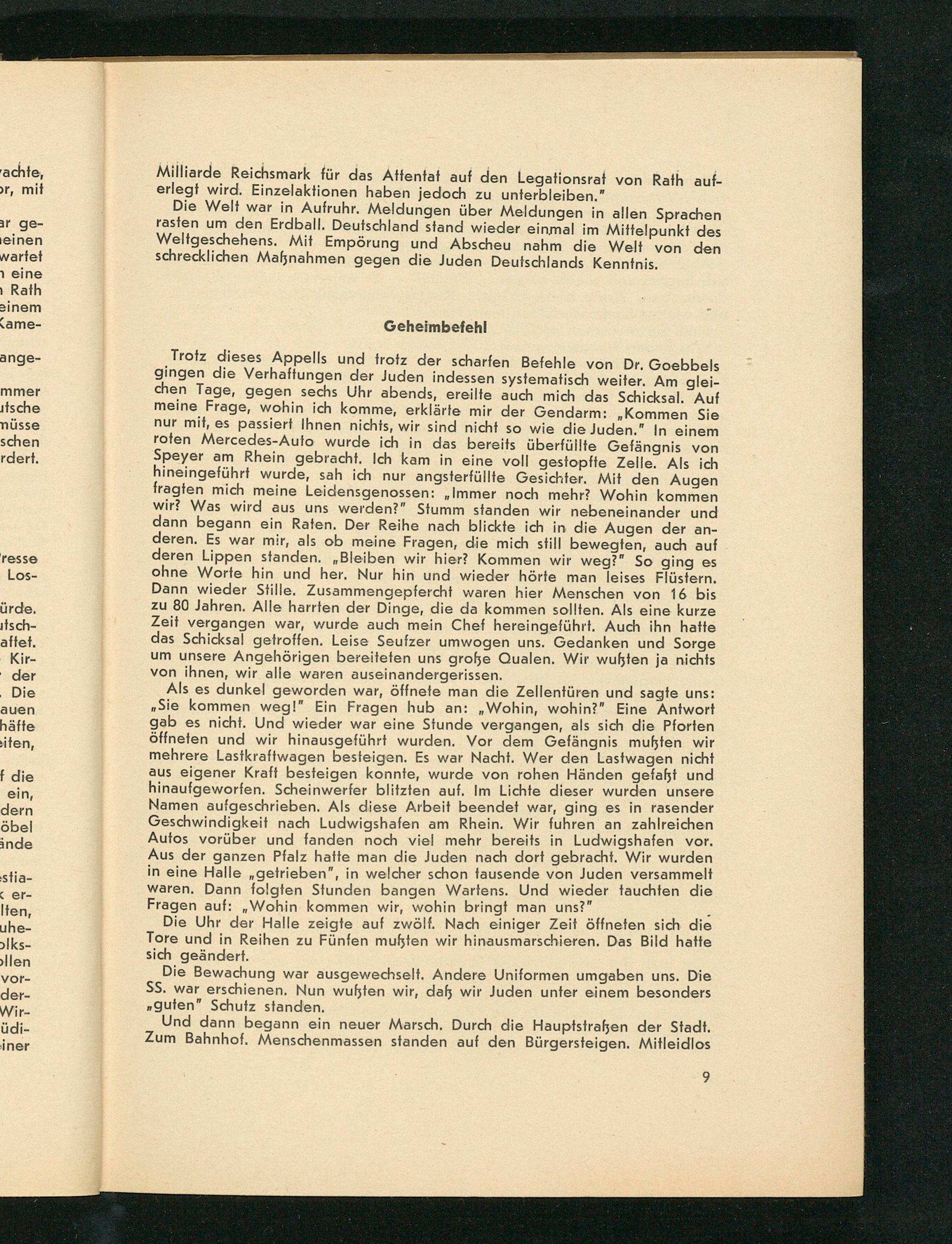 Als es dunkel geworden war, öffnete man die Zellentüren und sagte uns: " Sie kommen weg!" Ein Fragen hub an:" Wohin, wohin?" Eine Antwort gab es nicht. Und wieder war eine Stunde vergangen, als sich die Pforten öffneten und wir hinausgeführt wurden. Vor dem Gefängnis mußten wir mehrere Lastkraftwagen besteigen. Es war Nacht. Wer den Lastwagen nicht aus eigener Kraft besteigen konnte, wurde von rohen Händen gefaßt und hinaufgeworfen. Scheinwerfer blitzten auf. Im Lichte dieser wurden unsere Namen aufgeschrieben. Als diese Arbeit beendet war, ging es in rasender Geschwindigkeit nach Ludwigshafen am Rhein . Wir fuhren an zahlreichen Autos vorüber und fanden noch viel mehr bereits in Ludwigshafen vor. Aus der ganzen Pfalz hatte man die Juden nach dort gebracht. Wir wurden in eine Halle getrieben", in welcher schon tausende von Juden versammelt waren. Dann folgten Stunden bangen Wartens. Und wieder tauchten die Fragen auf: Wohin kommen wir, wohin bringt man uns?"