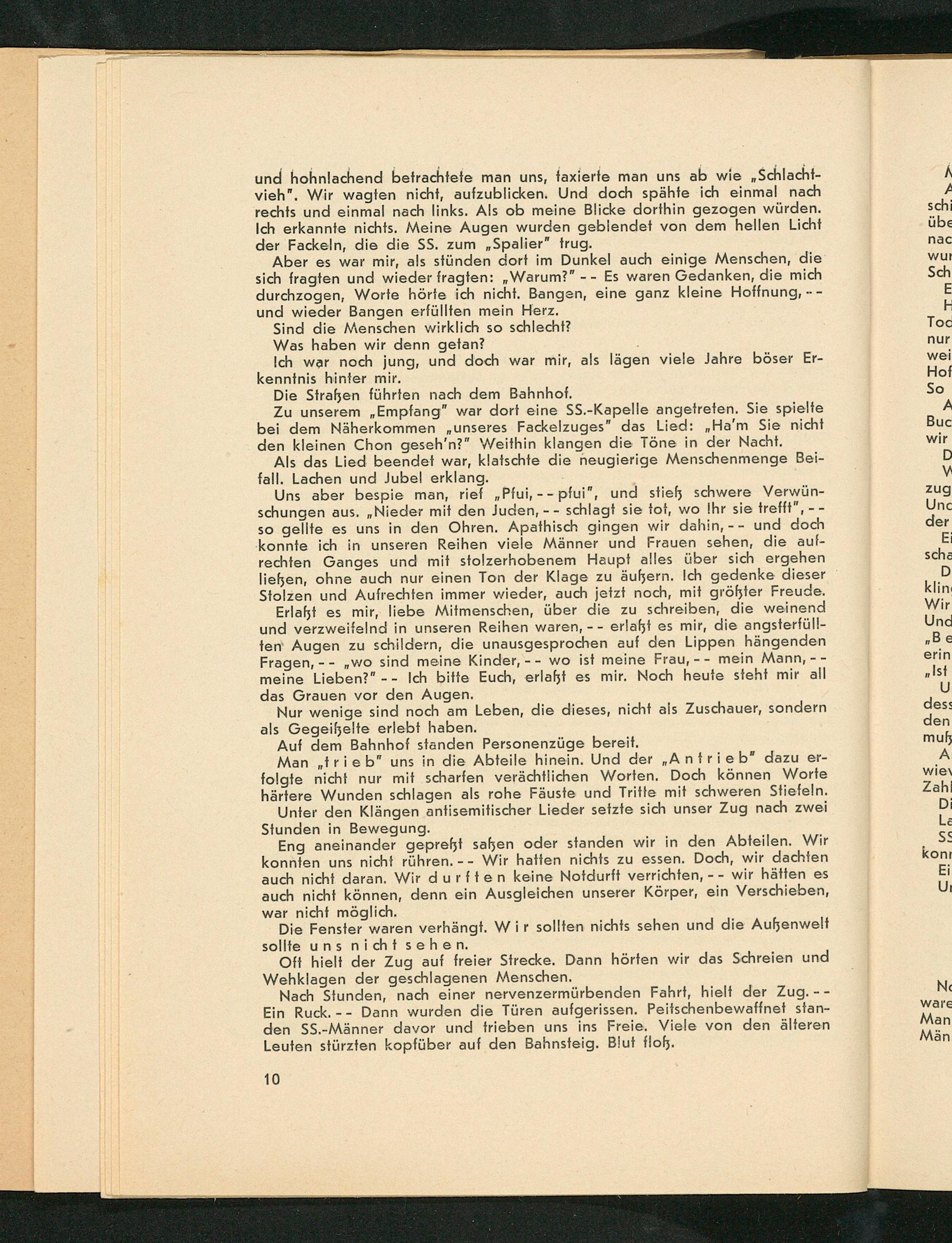 Man„trieb” uns in die Abteile hinein. Und der„Antrie b” dazu er- folgte nicht nur mit scharfen verächtlichen Worten. Doch können Worte härtere Wunden schlagen als rohe Fäuste und Tritte mit schweren Stiefeln.