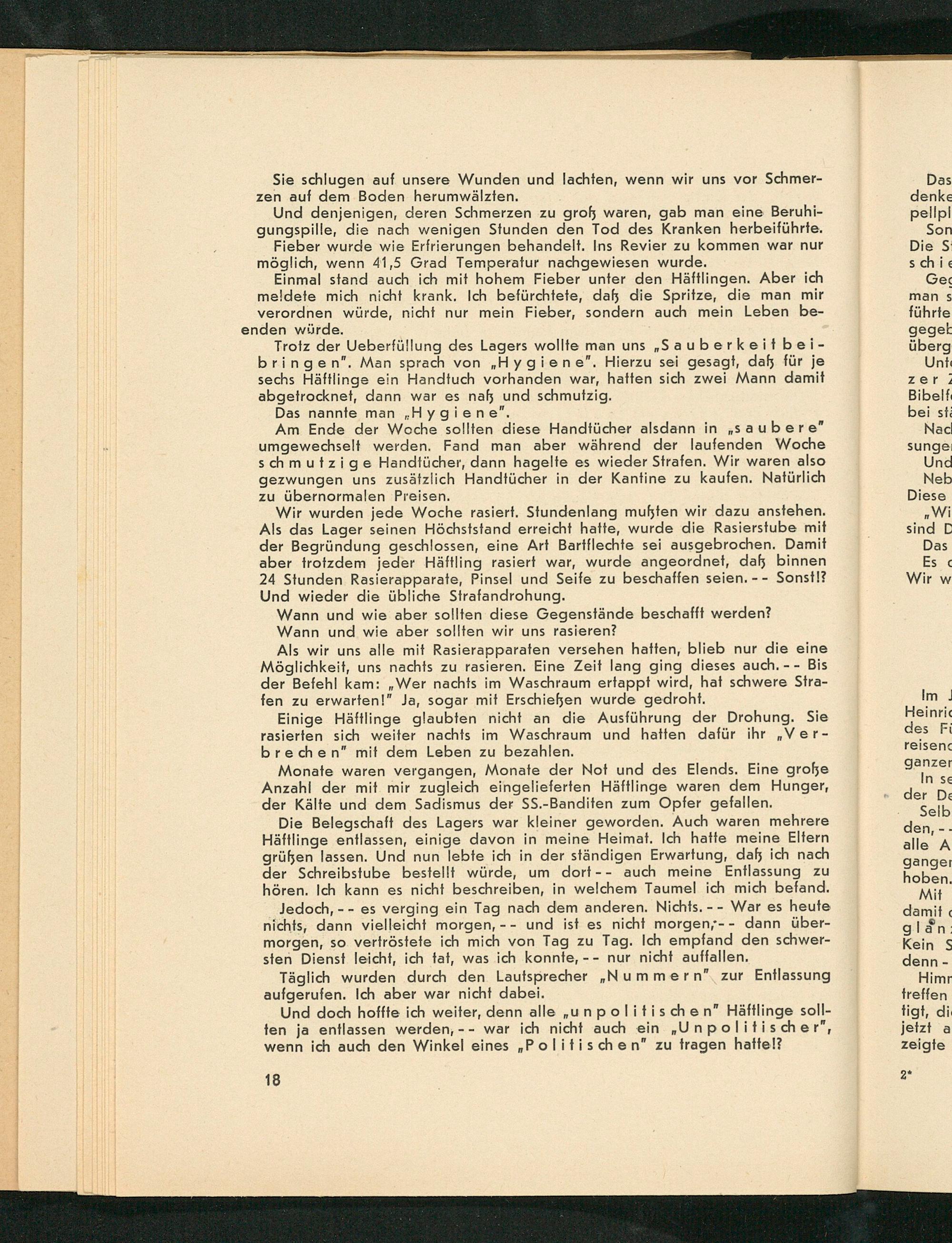 Und doch hoffte ich weiter, denn alle un politischen" Häftlinge sollten ja entlassen werden,-- war ich nicht auch ein" Un politischer", wenn ich auch den Winkel eines Politisch e n" zu tragen hatte!?