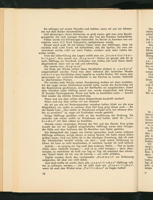 Trotz der Ueberfüllung des Lagers wollte man uns„ Sauberkeit beibringen". Man sprach von" Hygiene". Hierzu sei gesagt, daß für je sechs Häftlinge ein Handtuch vorhanden war, hatten sich zwei Mann damit abgetrocknet, dann war es naß und schmutzig.