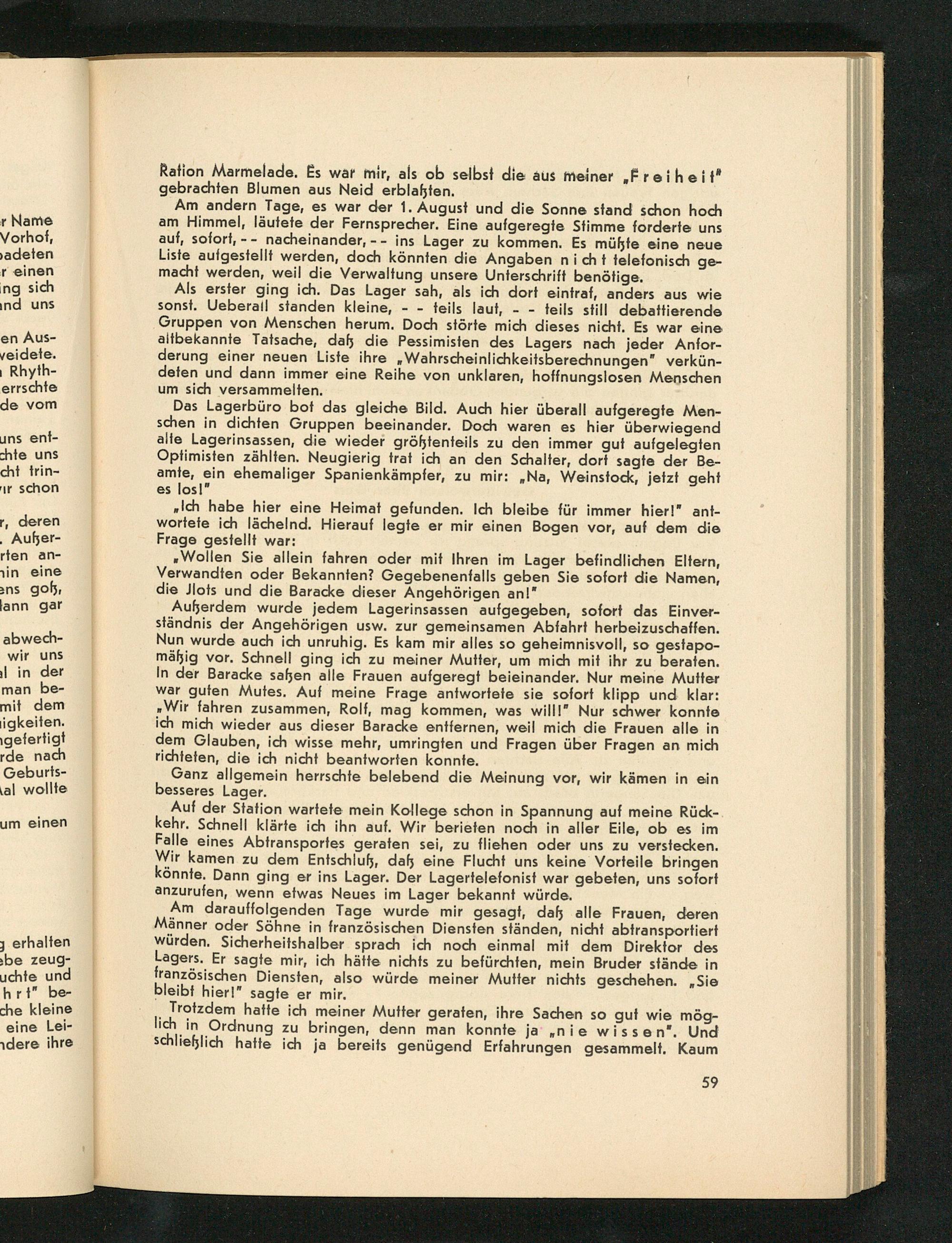 Das Lagerbüro bot das gleiche Bild. Auch hier überall aufgeregte Menschen in dichten Gruppen beeinander. Doch waren es hier überwiegend alte Lagerinsassen, die wieder größtenteils zu den immer gut aufgelegten Optimisten zählten. Neugierig trat ich an den Schalter, dort sagte der Beamte, ein ehemaliger Spanienkämpfer, zu mir:„ Na, Weinstock, jetzt geht es los!"