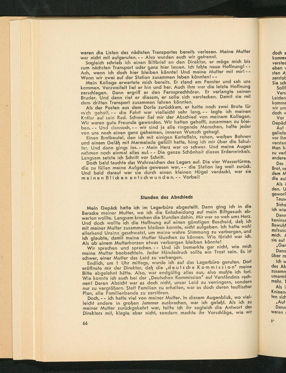 Endlich, um 1 Uhr mittags, wurde ich auf das Lagerbüro gerufen. Dort eröffnete mir der Direktor, daß die deutsche Kommission" meine Bitte abgelehnt hätte. Also, war endgültig alles aus, also mußte ich fort. Wie konnte ich auch bei der Deutschen Kommission" auf Verständnis rechnen! Deren Absicht war es doch nicht, unser Leid zu verringern, sondern nur zu vergrößern. Statt Familien zu erhalten, war es doch deren teuflischer Plan, alle Familienbande zu zerstören.