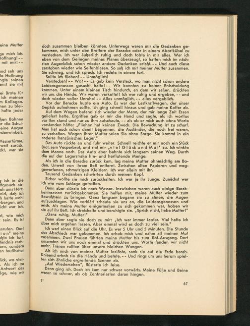 Vor der Baracke hupte ein Auto. Es war der Lastkraftwagen, der unser Gepäck aufnehmen sollte. Ich ging schnell hinaus und gab meine Koffer ab. Auf dem Wagen befand sich wieder der Mann, der mir lange Zeit Essen geliefert hatte. Ergriffen gab er mir die Hand und sagte, als ich wortlos vor ihm stand und nur zu ihm aufschaute,-- als ob er mich auch ohne Worte verstanden hätte: Fliehen hat keinen Zweck. Die Bewachung ist zu scharf. Man hat auch schon damit begonnen, die Ausländer, die noch frei waren, zu verhaffen. Wegen Ihrer Mutter seien Sie ohne Sorge. Sie kommt in ein anderes französisches Lager."