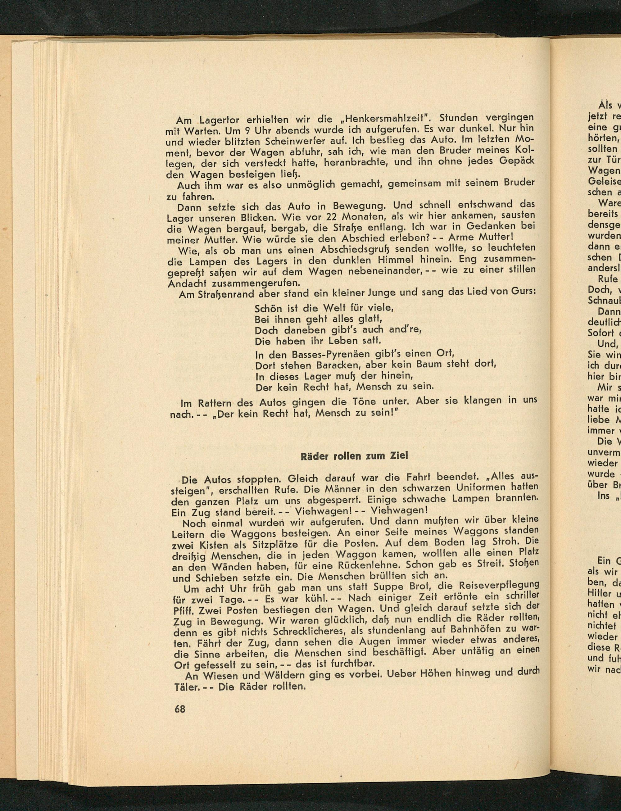 Am Lagertor erhielten wir die„ Henkersmahlzeit". Stunden vergingen mit Warten. Um 9 Uhr abends wurde ich aufgerufen. Es war dunkel. Nur hin und wieder blitzten Scheinwerfer auf. Ich bestieg das Auto. Im letzten Moment, bevor der Wagen abfuhr, sah ich, wie man den Bruder meines Kollegen, der sich versteckt hatte, heranbrachte, und ihn ohne jedes Gepäck den Wagen besteigen ließ.