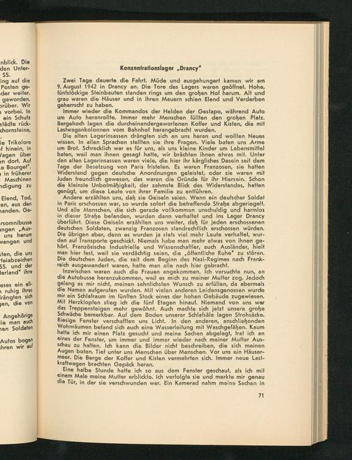 Die alten Lagerinsassen drängten sich an uns heran und wollten Neues wissen. In allen Sprachen stellten sie ihre Fragen. Viele baten unsArme um Brot. Schrecklich war es für uns, als uns kleine Kinder um Lebensmittel baten, weil man ihnen gesagt hatte, wir brächten ihnen etwas mit. Unter den alten Lagerinsassen waren viele, die hier ihr kärgliches Dasein seit dem Tage der Besetzung von Paris fristefen. Es waren Franzosen, sie hatten Widerstand gegen deutsche Anordnungen geleistet, oder sie waren mit Juden freundlich gewesen, das waren die Gründe für ihr Hiersein. Schon die kleinste Unbotmäßigkeit, der zahmste Blick des Widerstandes, hatten genügt, um diese Leute von ihrer Familie zu entführen.
