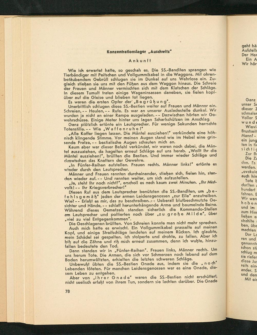 Wie ich erwartet hatte, so geschah es. Die SS. - Banditen sprangen wie Tierbändiger mit Peitschen und Vollgummikabel in die Waggons. Mit ohrenbetäubendem Gebrüll schlugen sie im Dunkel auf uns Wehrlose ein. Zugleich stießen sie uns mit den Füßen aus dem Waggon hinaus. Die Schreie der Frauen und Männer vermischten sich mit dem Klatschen der Schläge. In diesem Tumult traten einige Wageninsassen daneben, sie fielen kopfüber auf die Gleise und blieben tot liegen.