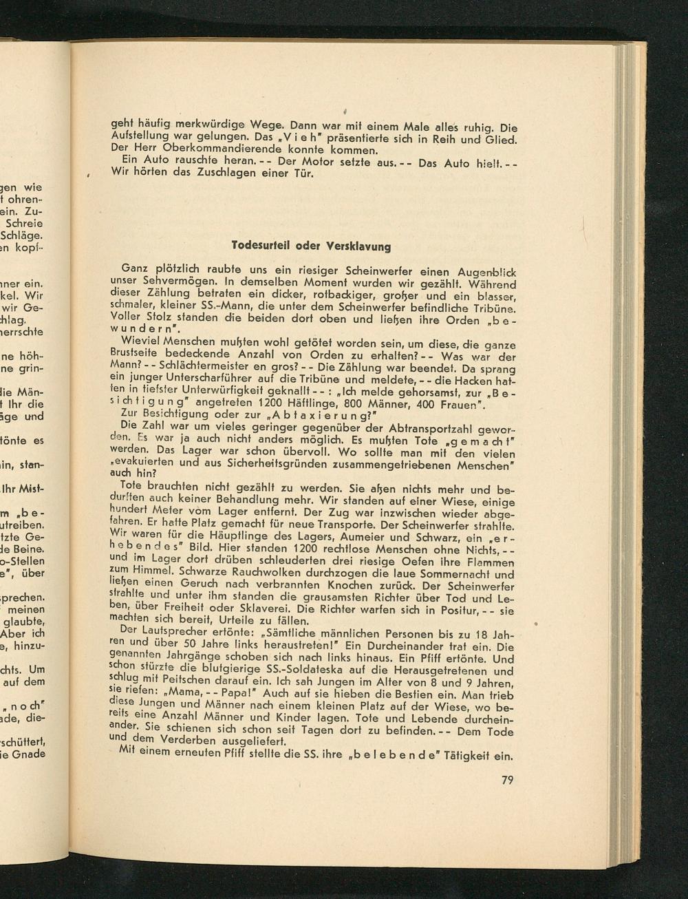 Der Lautsprecher ertönte:" Sämtliche männlichen Personen bis zu 18 Jahren und über 50 Jahre links heraustreten!" Ein Durcheinander trat ein. Die genannten Jahrgänge schoben sich nach links hinaus. Ein Pfiff ertönte. Und schon stürzte die blutgierige SS.- Soldateska auf die Herausgetretenen und schlug mit Peitschen darauf ein. Ich sah Jungen im Alter von 8 und 9 Jahren, sie riefen:„ Mama, - Papa!" Auch auf sie hieben die Bestien ein. Man trieb diese Jungen und Männer nach einem kleinen Platz auf der Wiese, wo bereits eine Anzahl Männer und Kinder lagen. Tote und Lebende durcheinander. Sie schienen sich schon seit Tagen dort zu befinden.-- Dem Tode und dem Verderben ausgeliefert.
