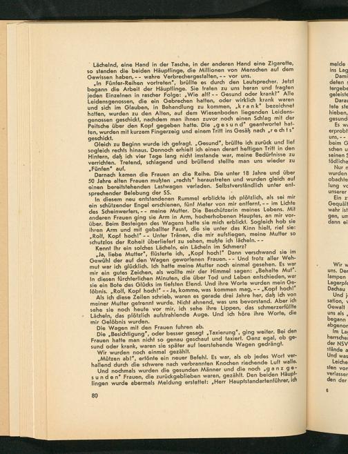 „ In Fünfer- Reihen vortreten", brüllte es durch den Lautsprecher. Jetzt begann die Arbeit der Häuptlinge. Sie traten zu uns heran und fragten jeden Einzelnen in rascher Folge:" Wie alt?-- Gesund oder krank?" Alle Leidensgenossen, die ein Gebrechen hatten, oder wirklich krank waren und sich im Glauben, in Behandlung zu kommen,„ krank" bezeichnet hatten, wurden zu den Alten, auf dem Wiesenboden liegenden Leidensgenossen geschickt, nachdem man ihnen zuvor noch einen Schlag mit der Peitsche über den Kopf gegeben hatte. Die„ gesund" geantwortet hatten, wurden mit kurzem Fingerzeig und einem Trift ins Gesäß nach rechts" geschickt.